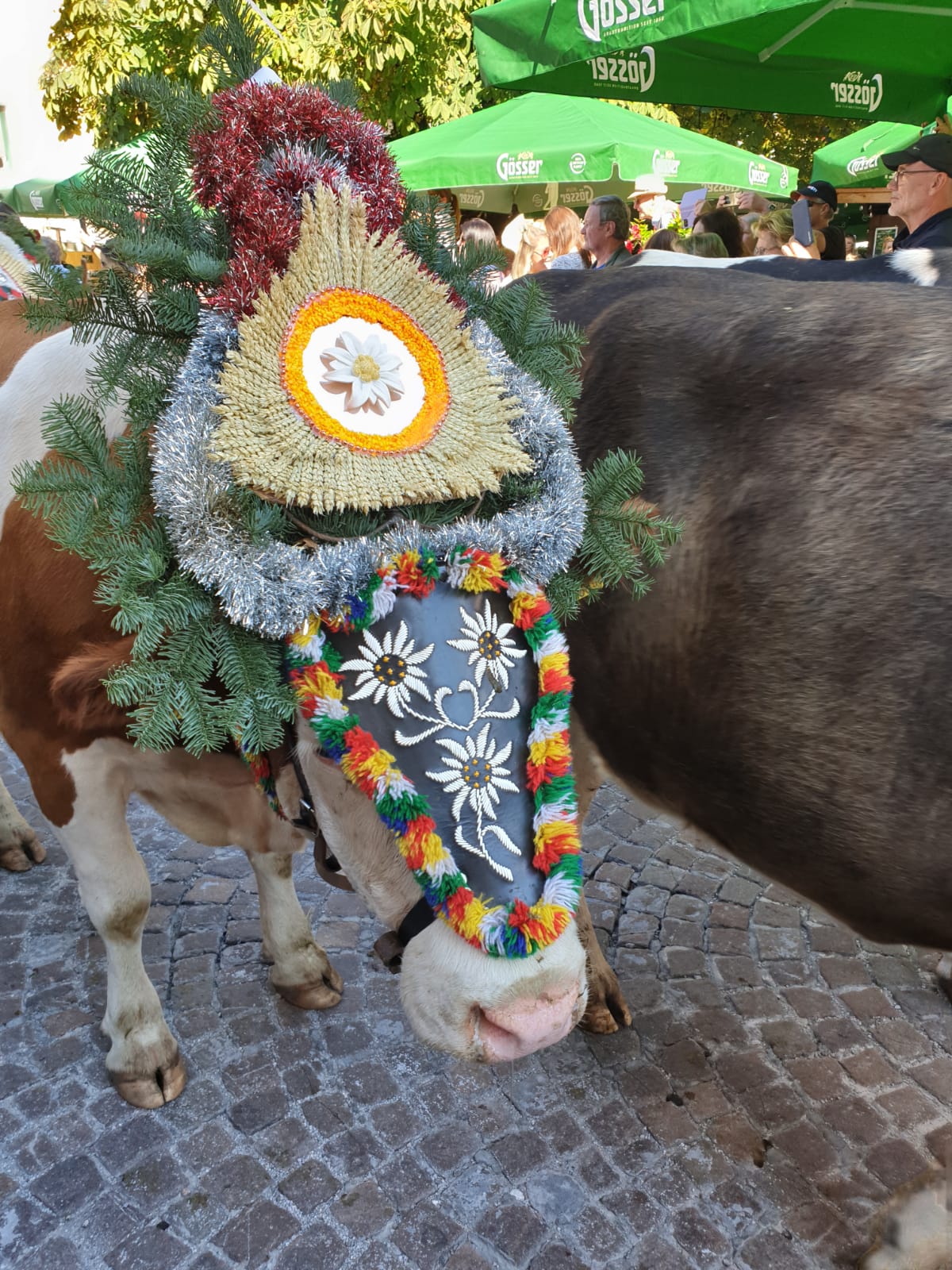 Punkt 12 Uhr trotteten dann die geschmückten, dickbäuchigen Schönheiten (Kühe) durch das Dorf. Sie setzten uns alle in Verzücken. Die Bauern hatten sich wirklich viel Mühe gemacht, und ihre Tiere toll geschmückt und die Glocken um den Hals der Tiere machten ein tolles Konzert.