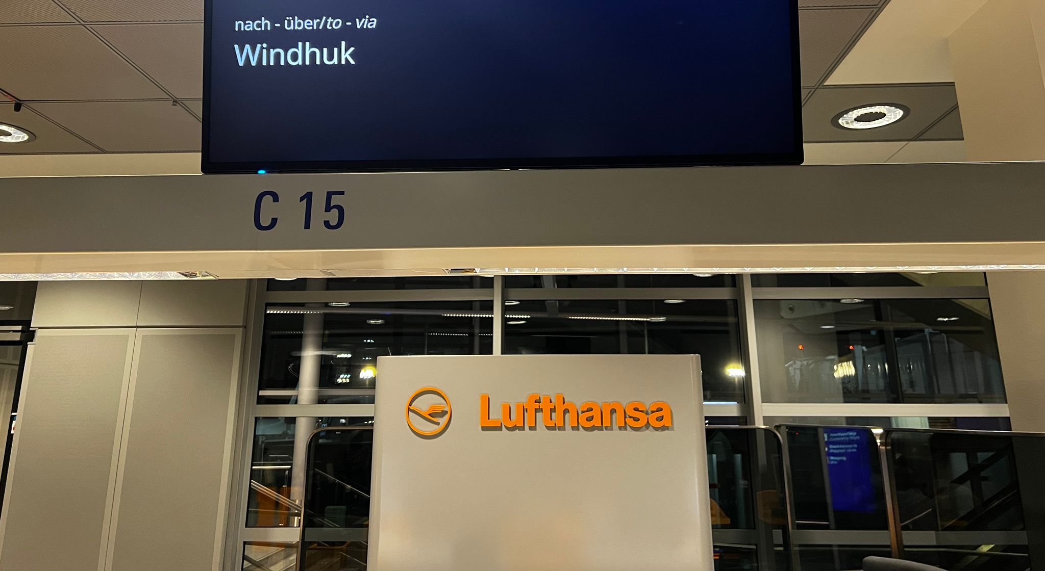 Durch die Flugverspätung auf dem Hinflug, hatten wir einen Tagesflug und kamen am Abend am Flughafen in Windhoek an.