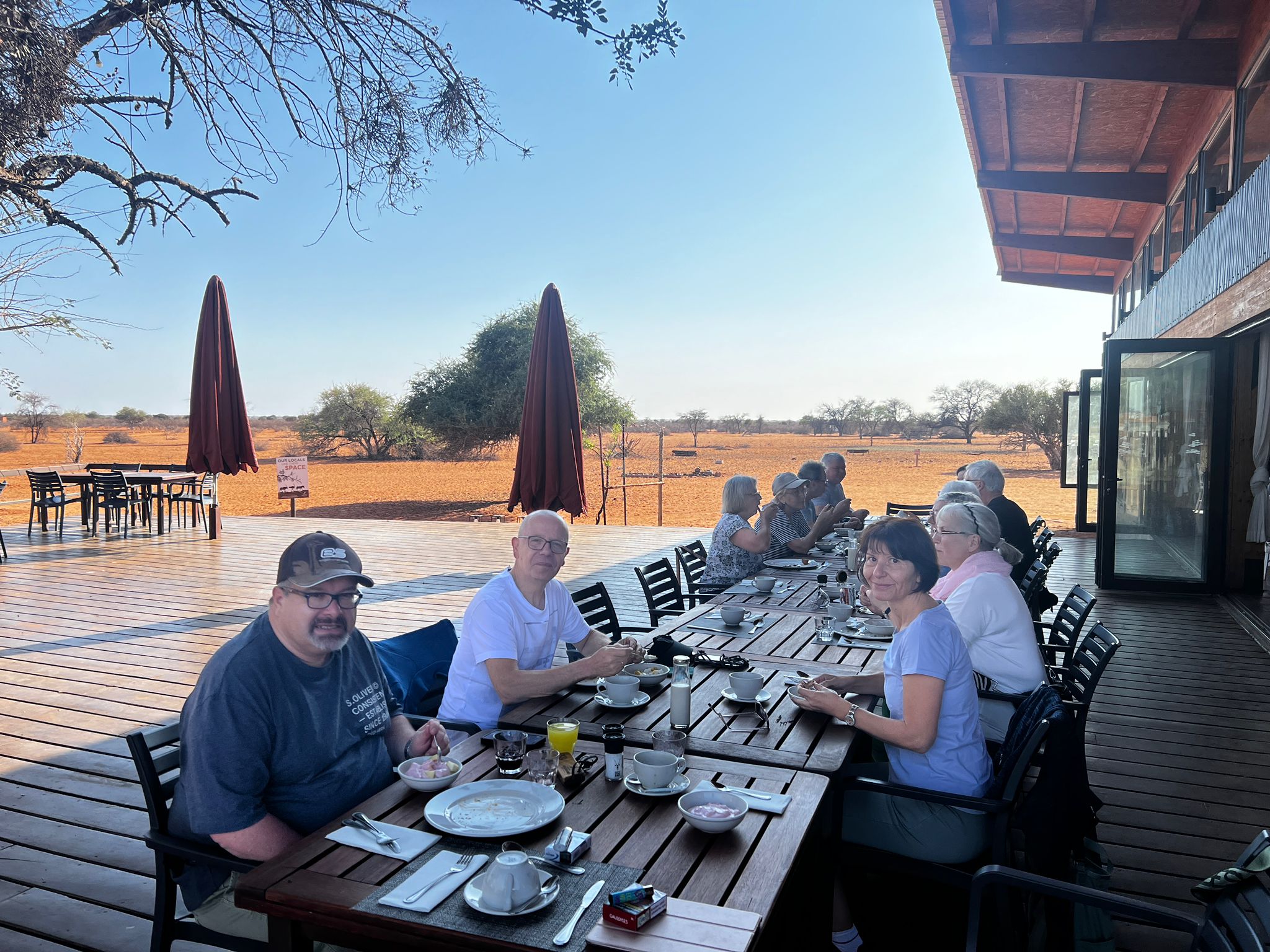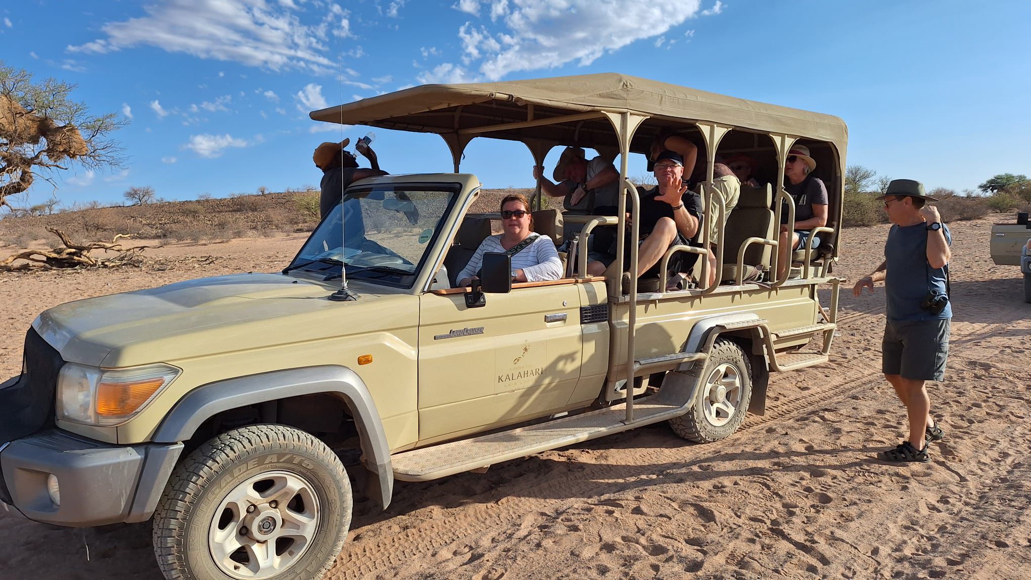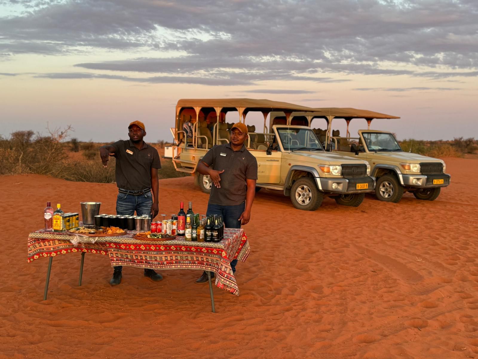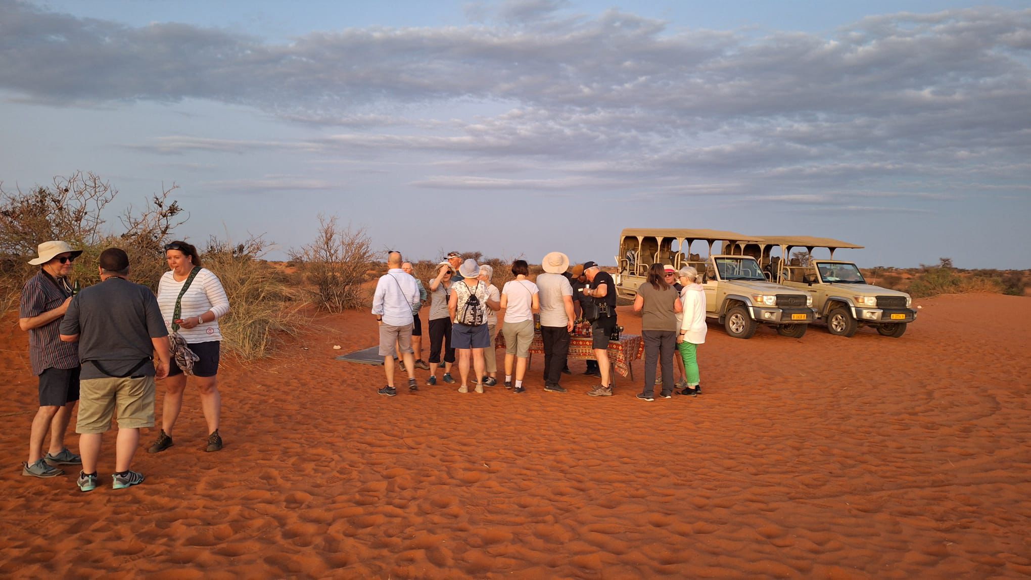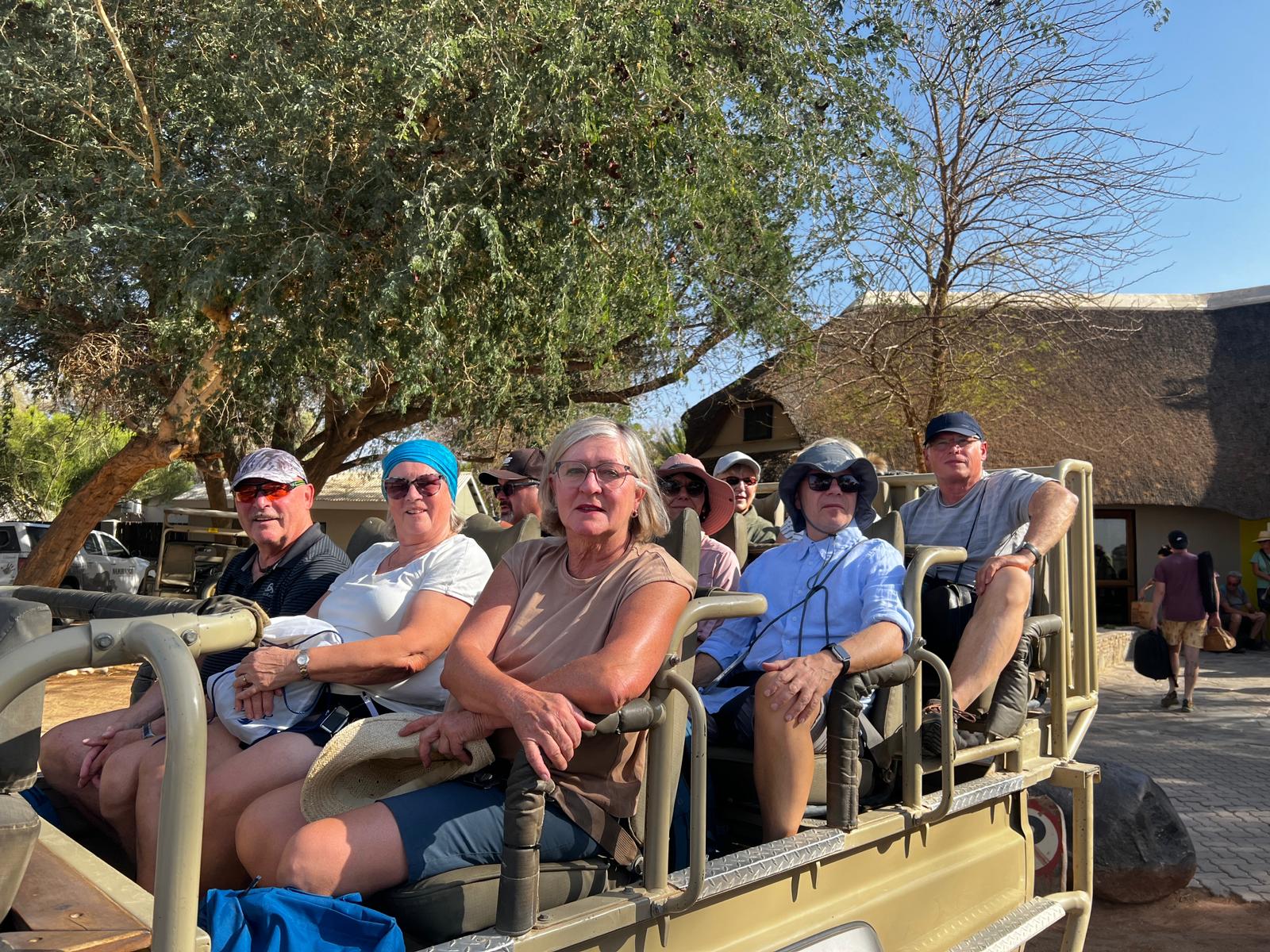 bevor es frühen Abend zu unserer 1. Sundownerfahrt in offenen Jeeps durch die Kalahari ging. Die ersten Wildtiere wurden von uns gesichtet, wie Springbock, Orey und auch die ersten Giraffen.