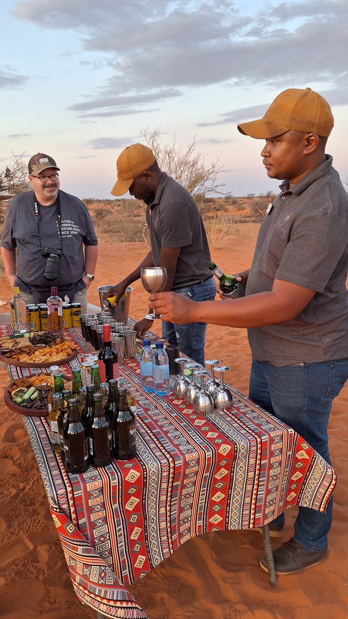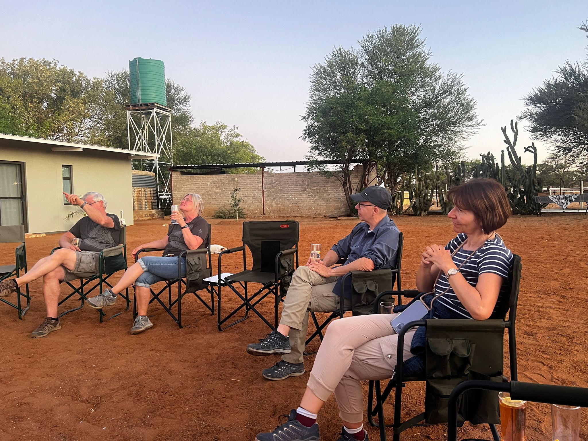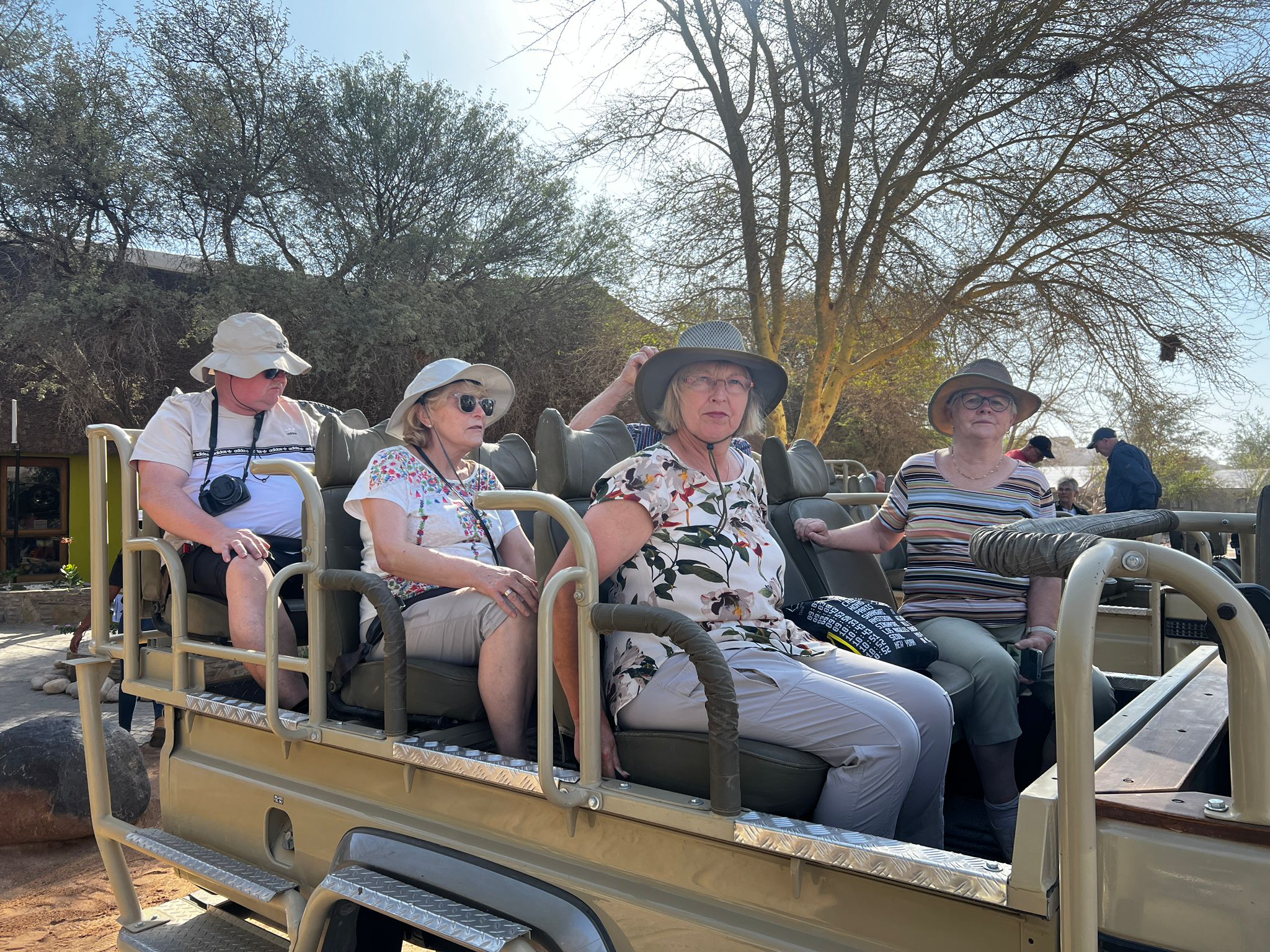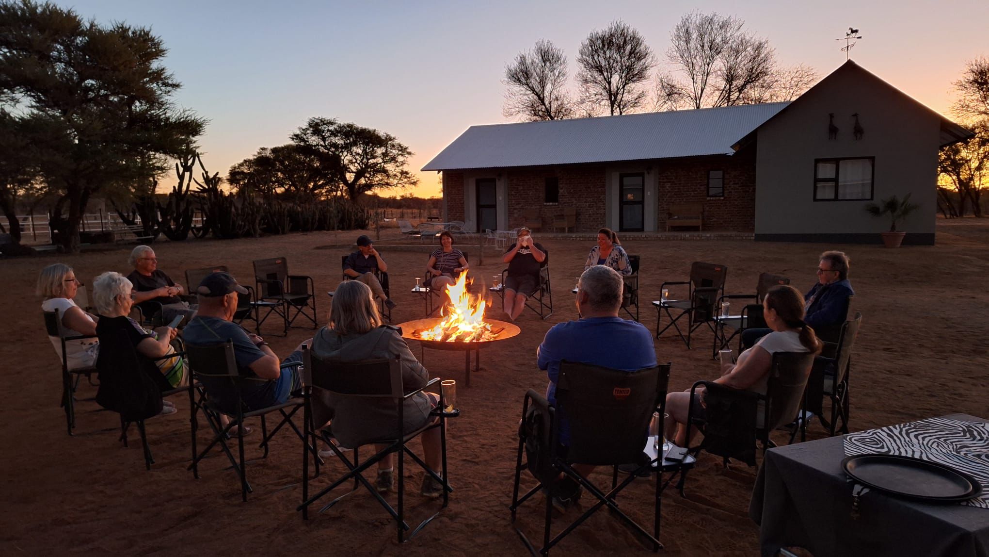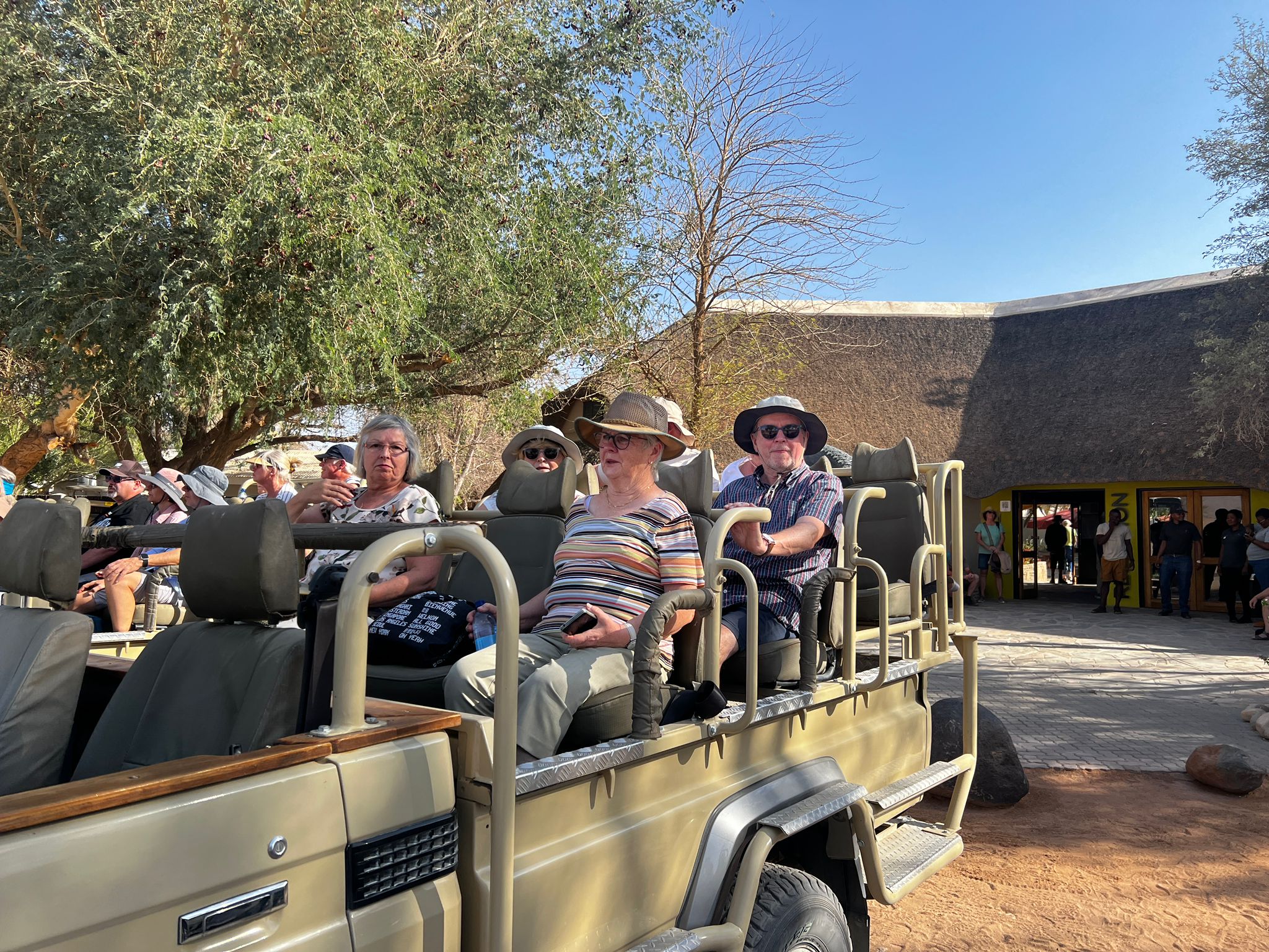 bevor es frühen Abend zu unserer 1. Sundownerfahrt in offenen Jeeps durch die Kalahari ging. Die ersten Wildtiere wurden von uns gesichtet, wie Springbock, Orey und auch die ersten Giraffen.