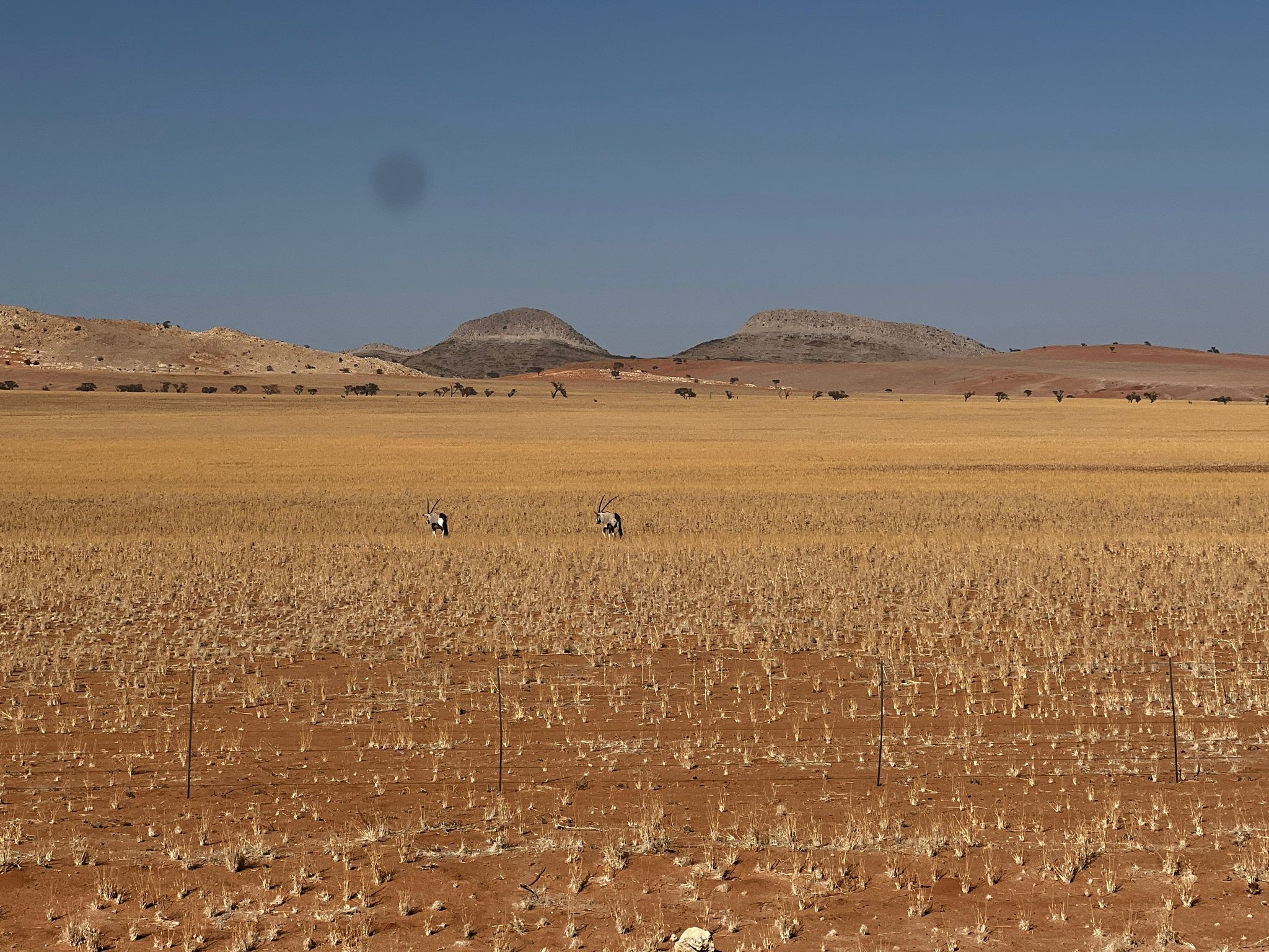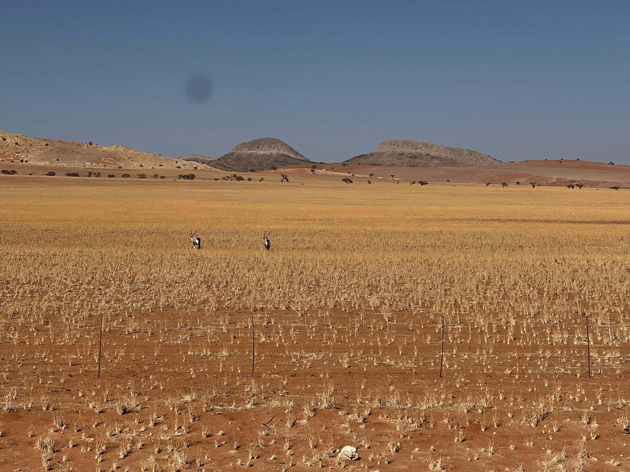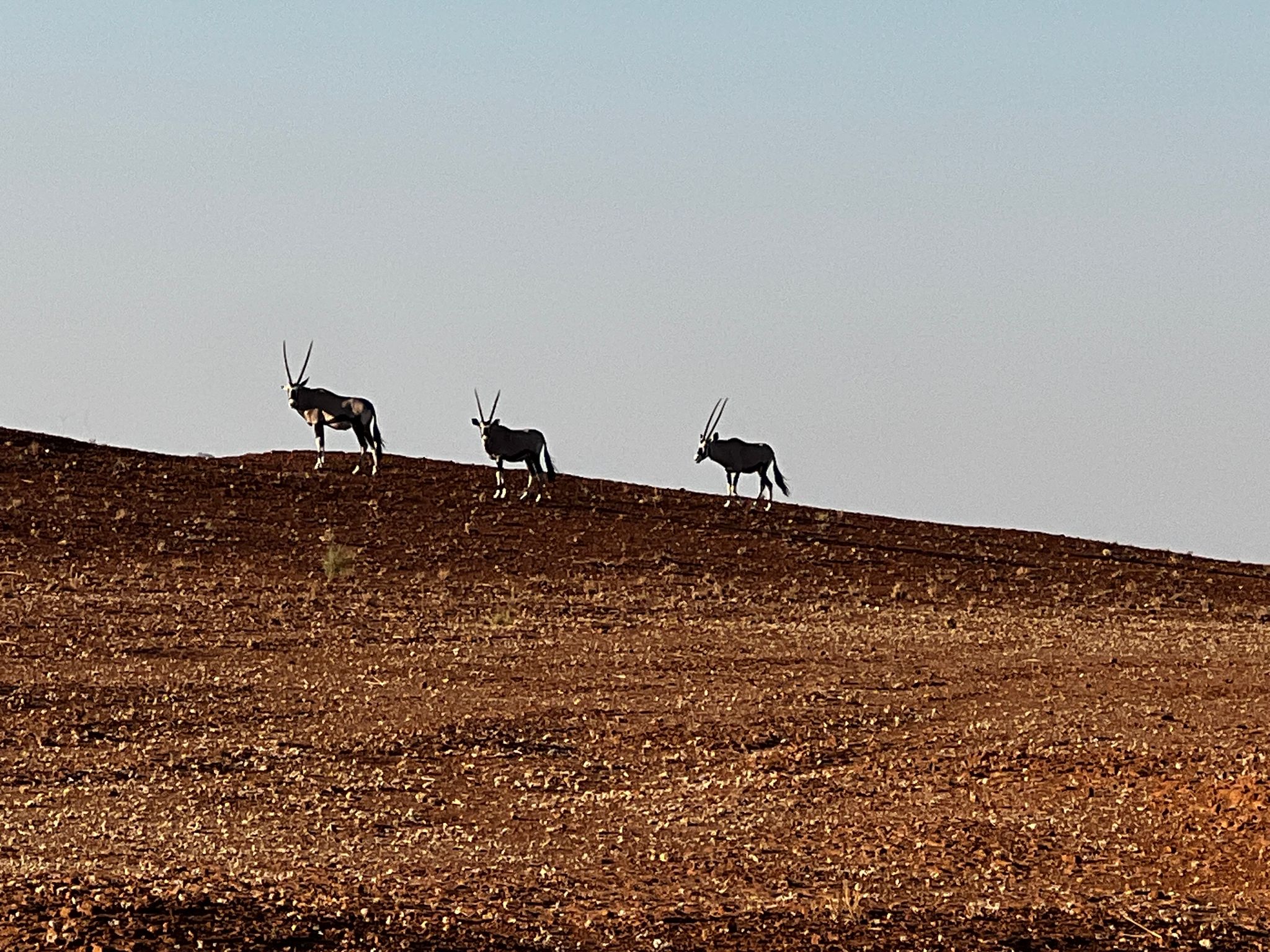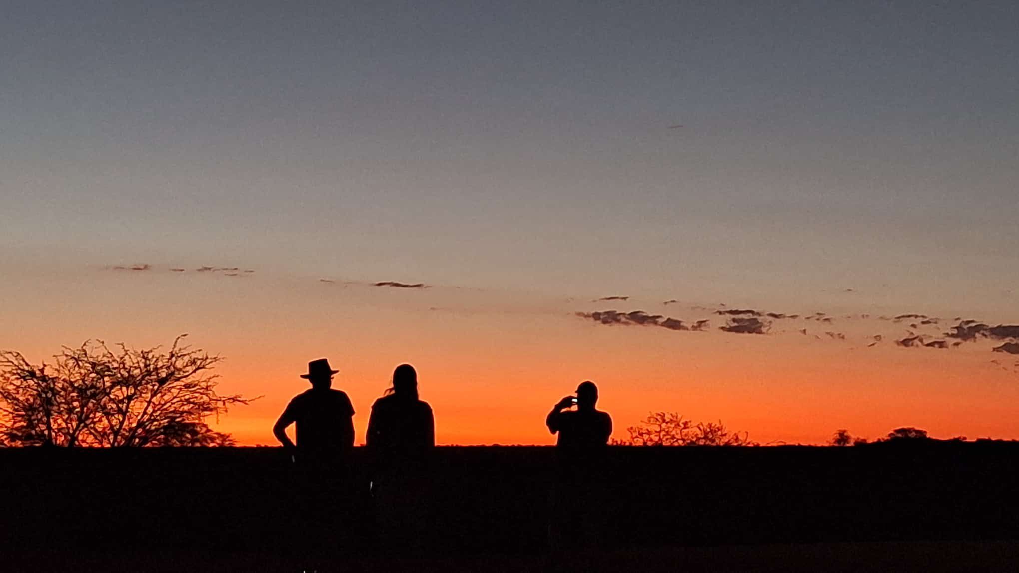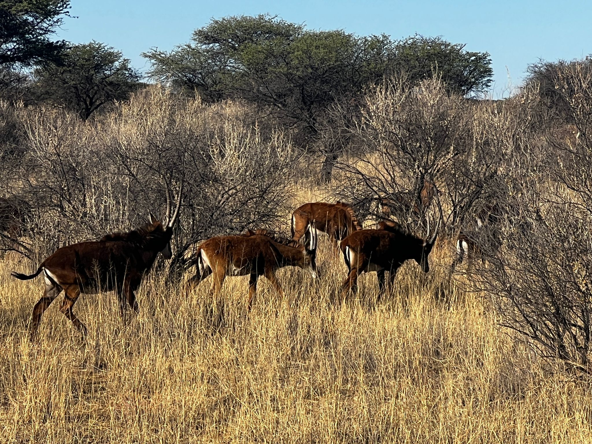bevor es frühen Abend zu unserer 1. Sundownerfahrt in offenen Jeeps durch die Kalahari ging. Die ersten Wildtiere wurden von uns gesichtet, wie Springbock, Orey und auch die ersten Giraffen.