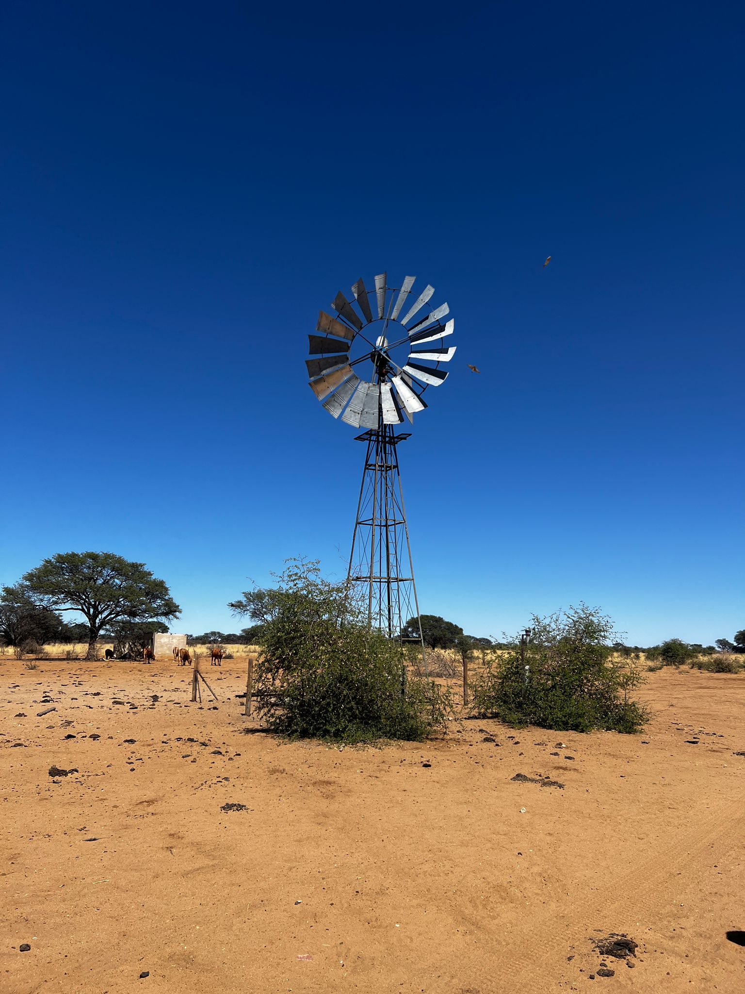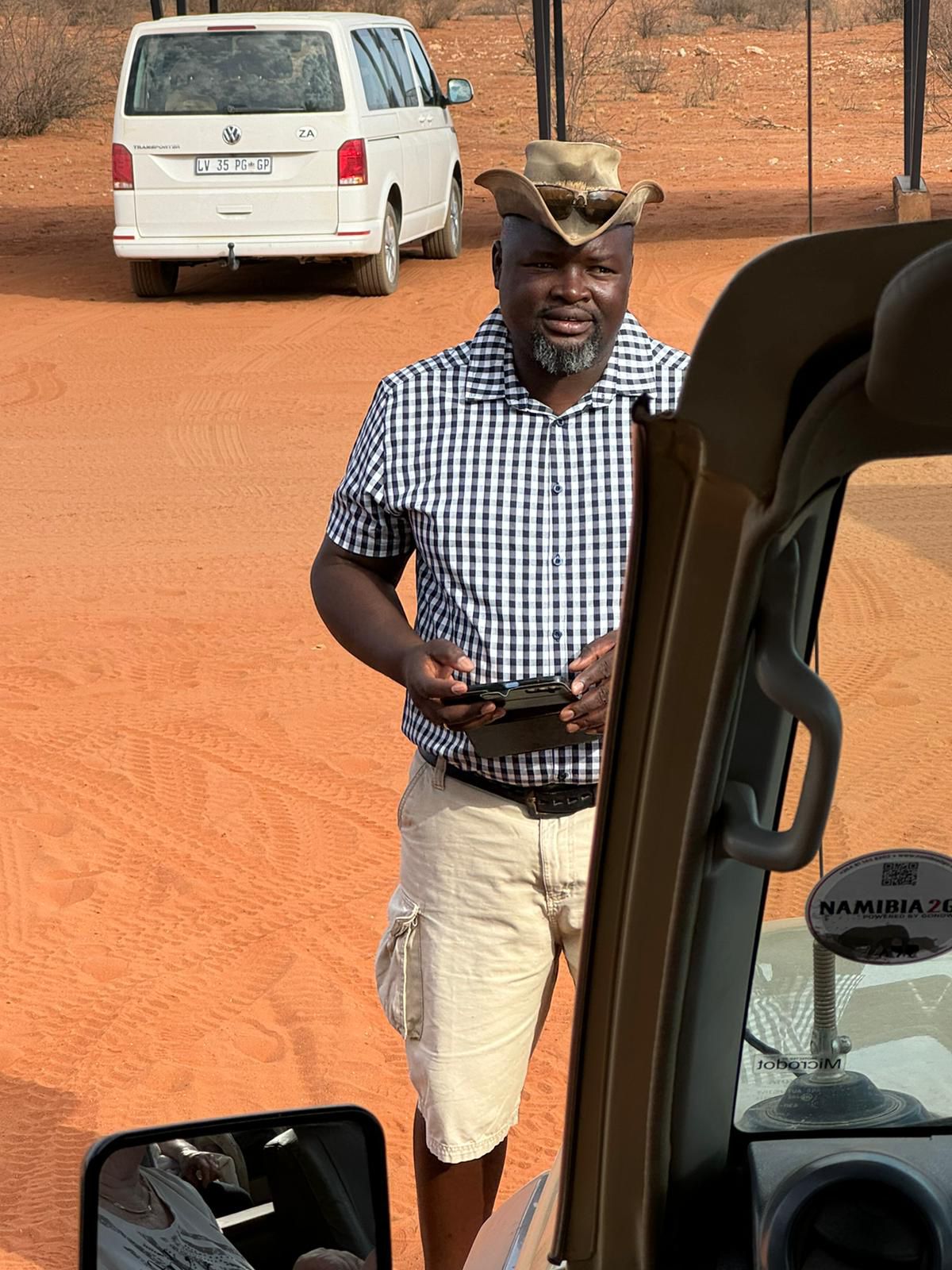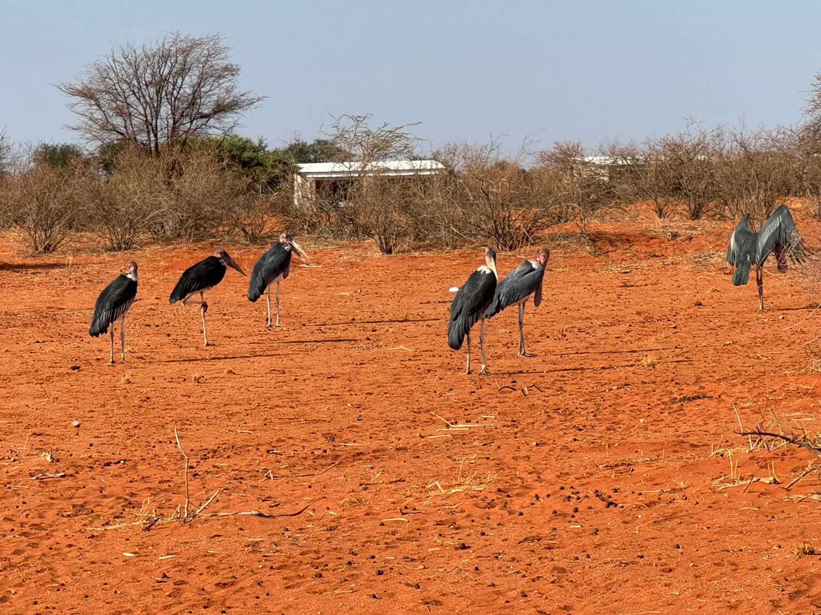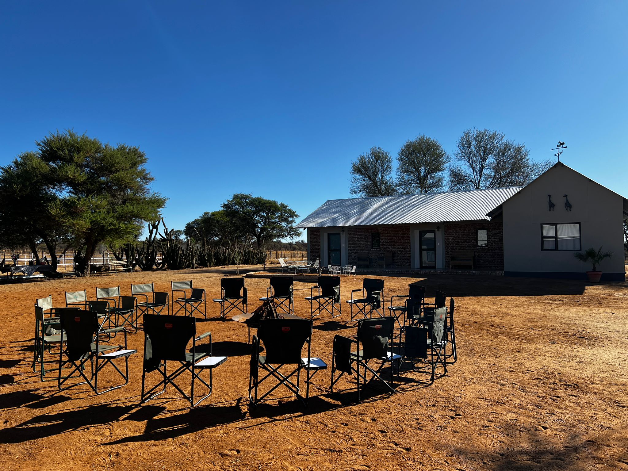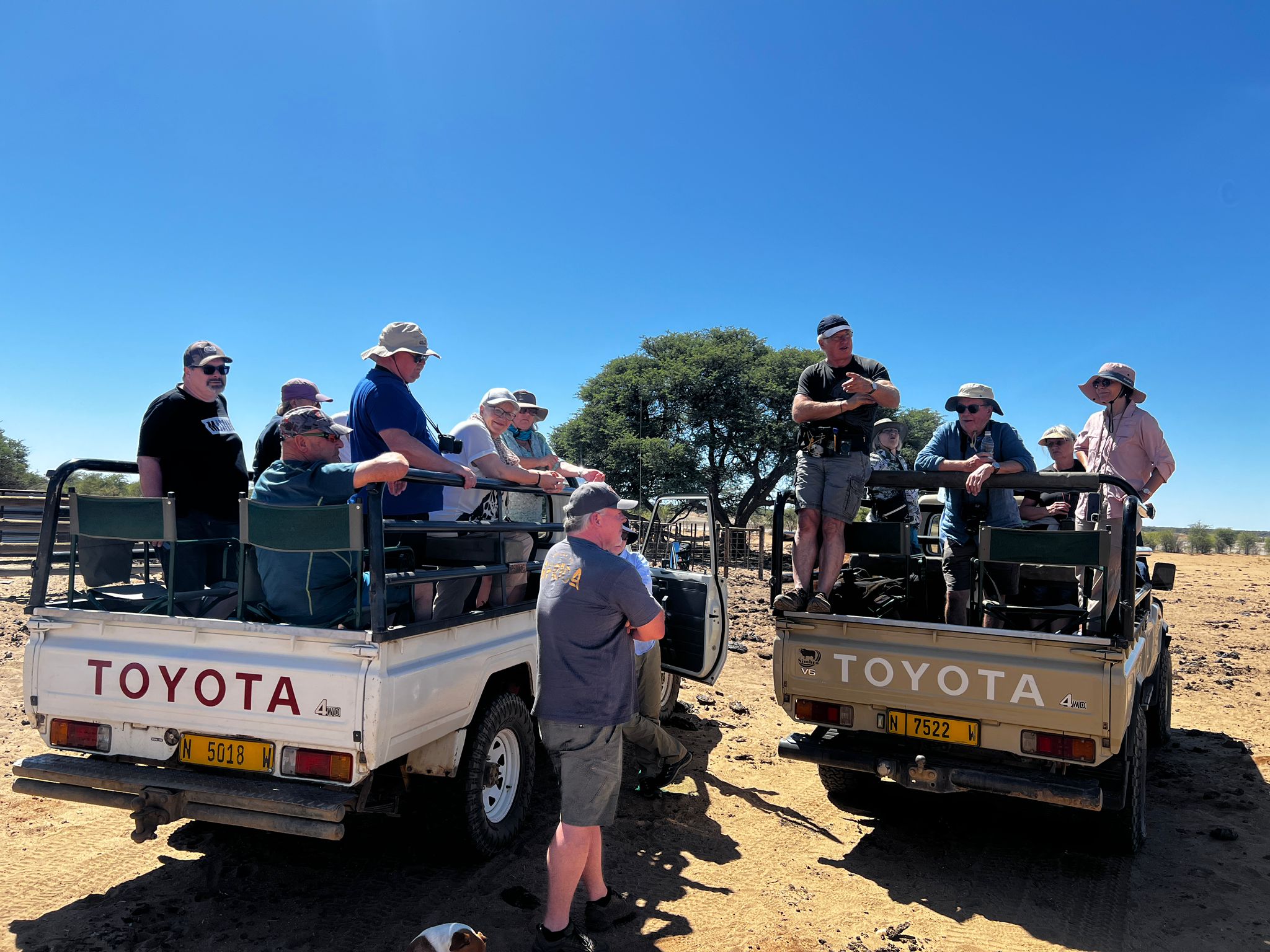 bevor es frühen Abend zu unserer 1. Sundownerfahrt in offenen Jeeps durch die Kalahari ging. Die ersten Wildtiere wurden von uns gesichtet, wie Springbock, Orey und auch die ersten Giraffen.
