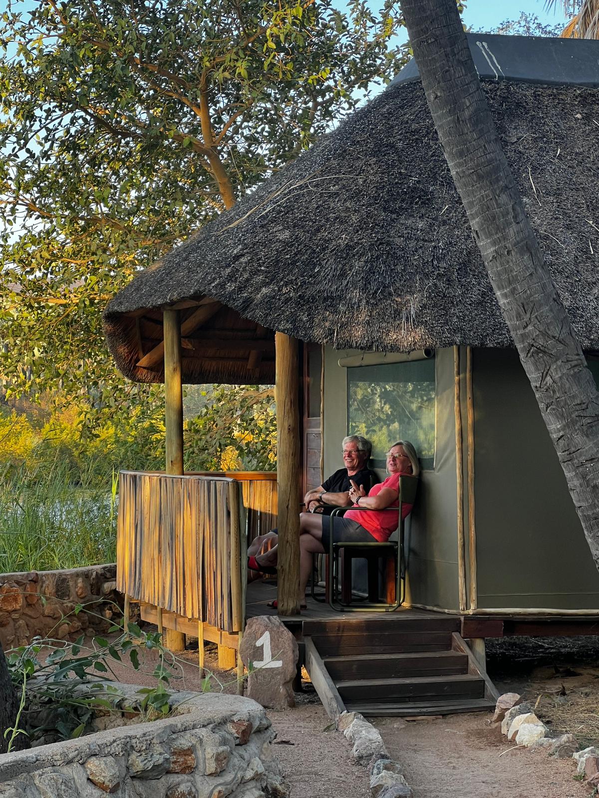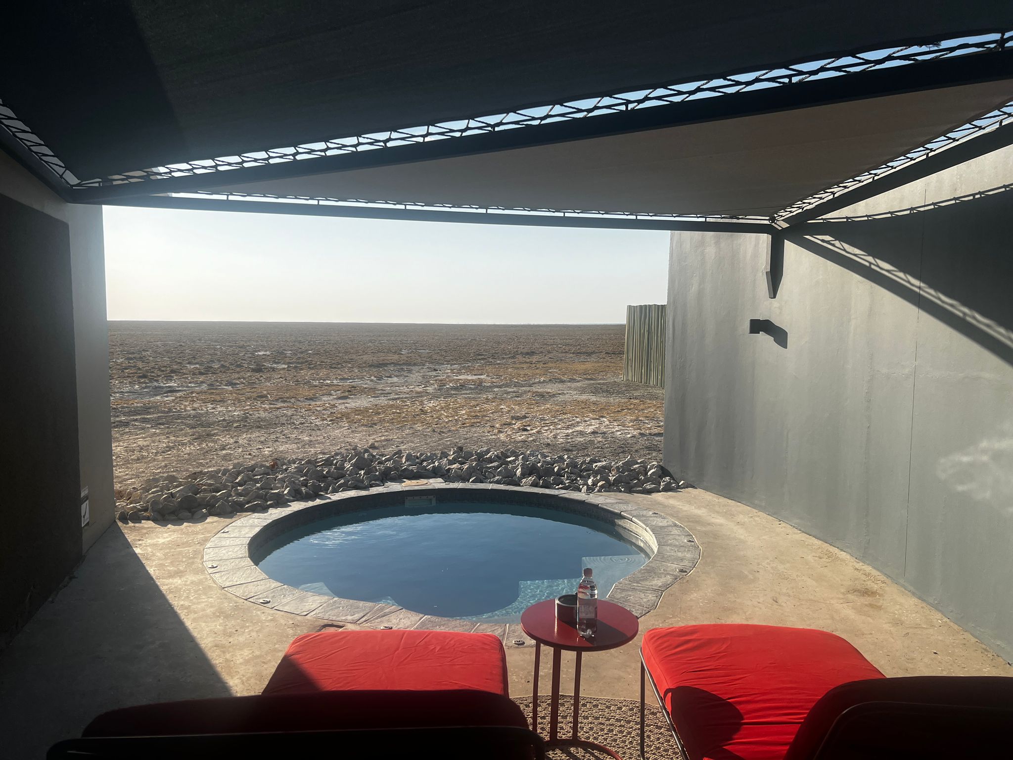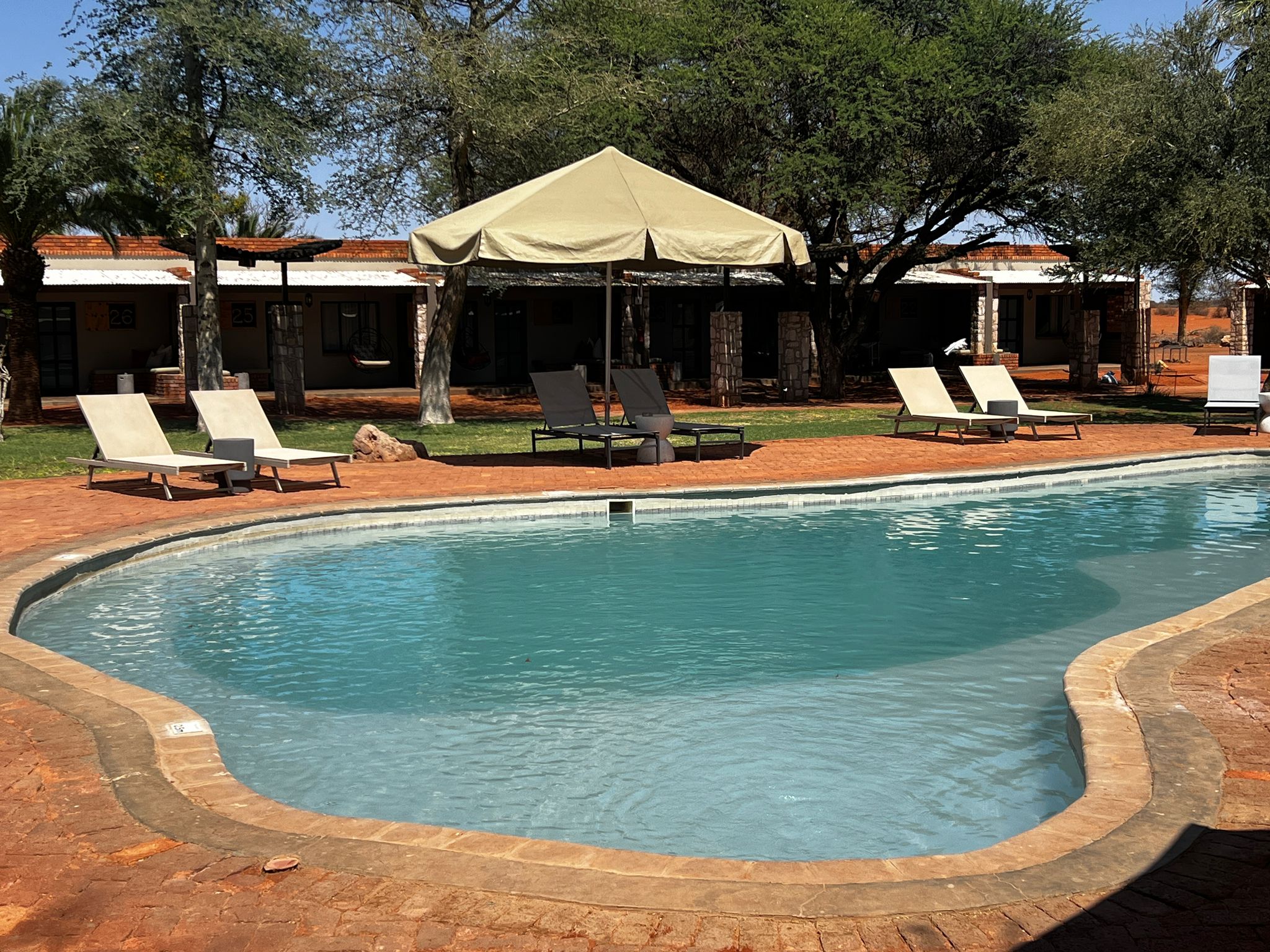 Am Nachmittag haben wir unseren privaten Pool genossen, denn am nächsten Tag wartete ein weiteres Highlight der Rundreise auf uns. Die Lodge Otjiwa! Im Stil einer Farmlodge mit viel Liebe zum Detail, was die Dekoration angeht,