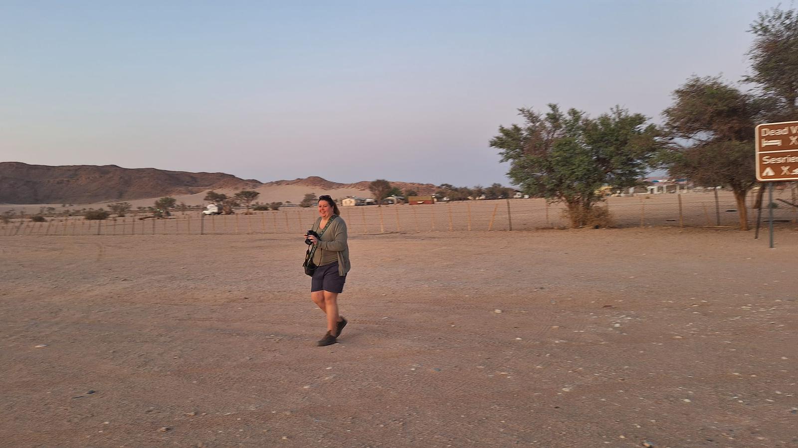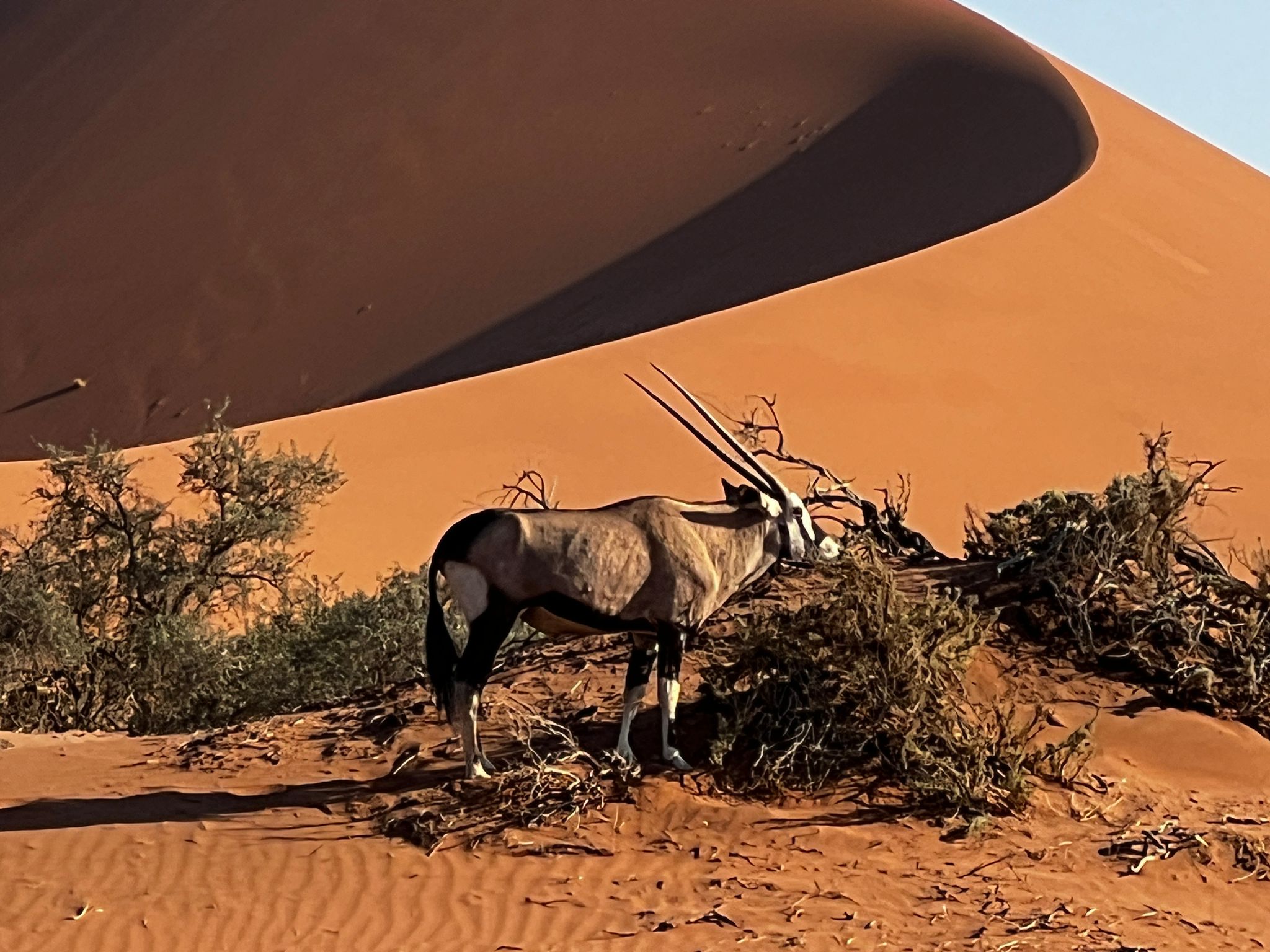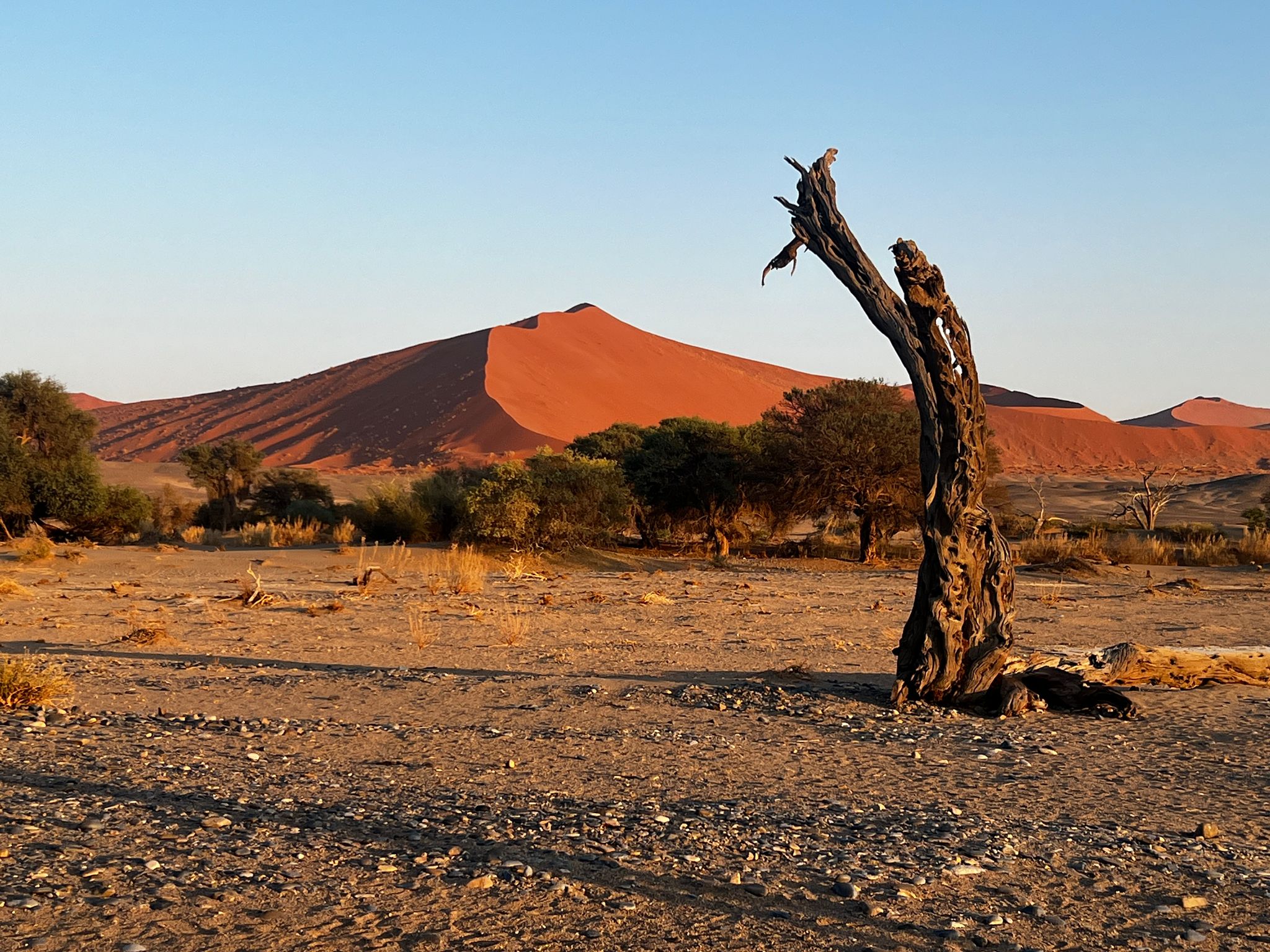 Nach ca. 60 km Fahrt durch diese faszinierende Landschaft stiegen wir auf offenen Geländewägen um und fahren ins weltberühmte Sossusvlei. Hier hatten wir die Möglichkeit eine der hohen Dünen zu besteigen und ließen uns danach unser Frühstück