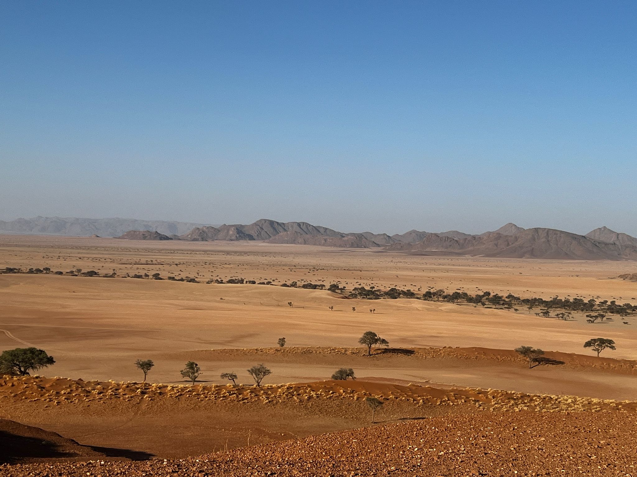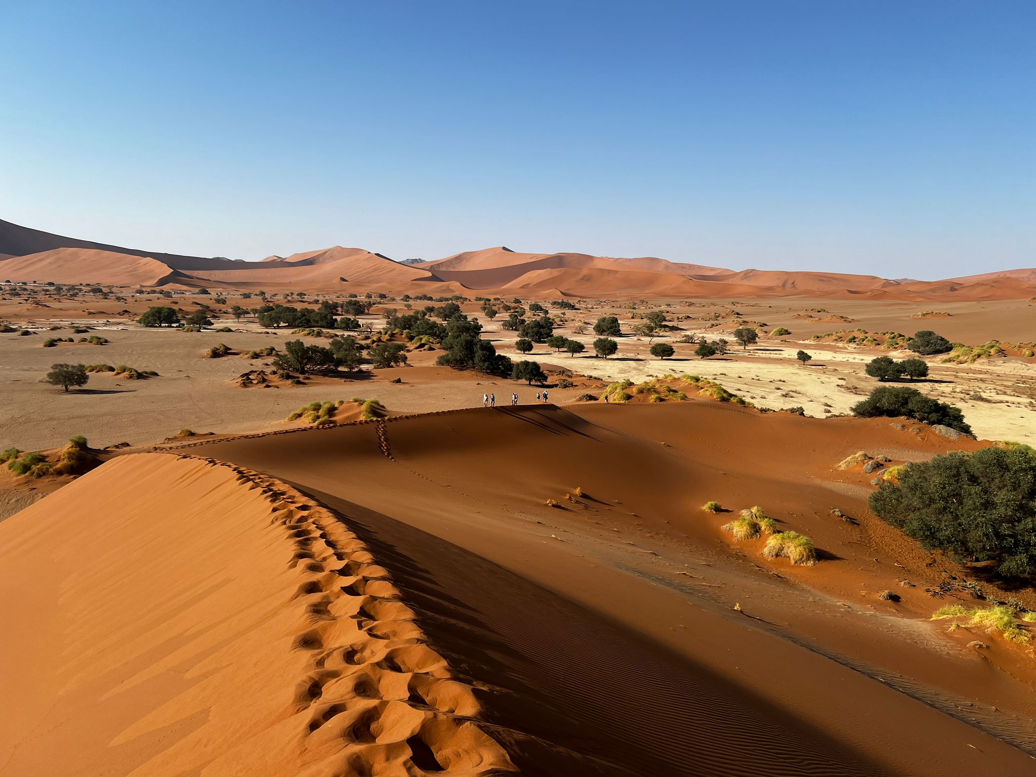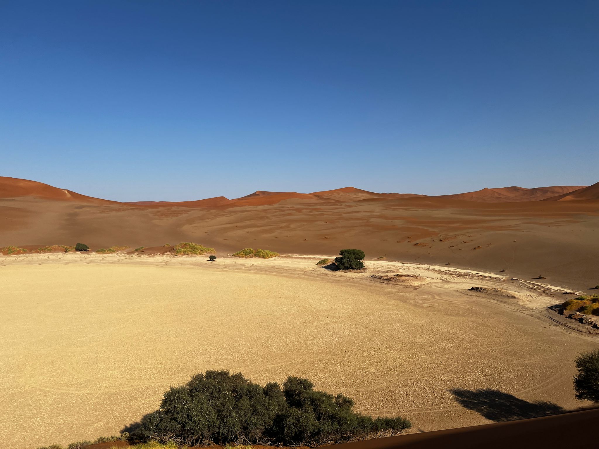 Nach ca. 60 km Fahrt durch diese faszinierende Landschaft stiegen wir auf offenen Geländewägen um und fahren ins weltberühmte Sossusvlei. Hier hatten wir die Möglichkeit eine der hohen Dünen zu besteigen und ließen uns danach unser Frühstück