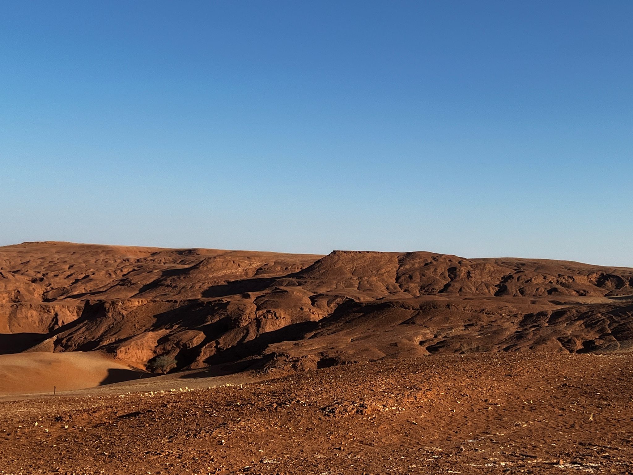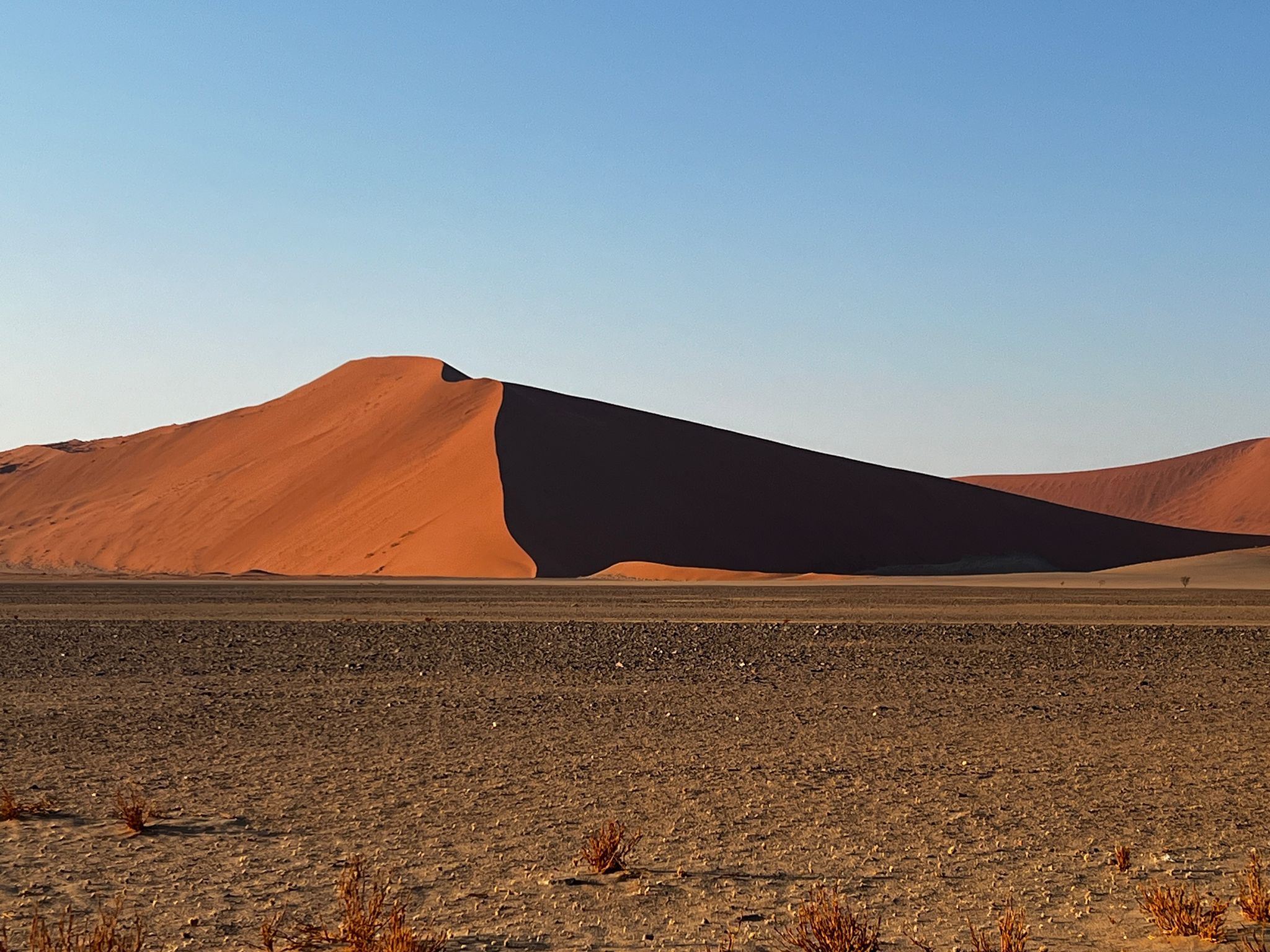 Am nächsten frühen Morgen hat alles perfekt geklappt, so dass wir als eines der ersten Autos in den Namib Naukluft Park fahren konnten. Im Schattenspiel des Sonnenaufgangs lagen die sternförmigen, höchsten Dünen der Welt vor uns.