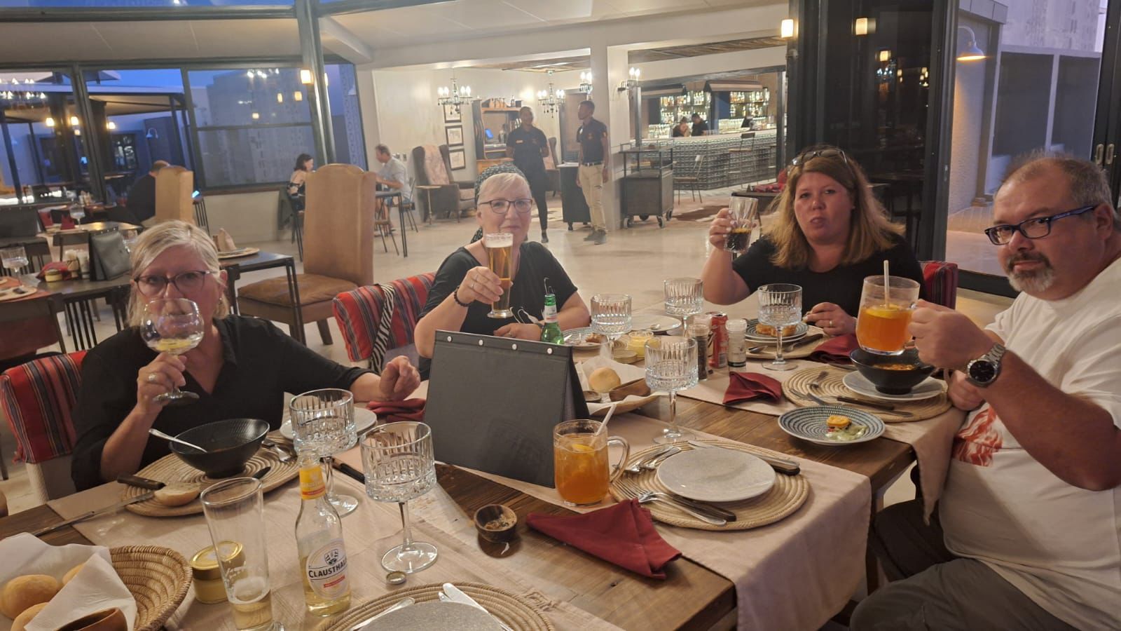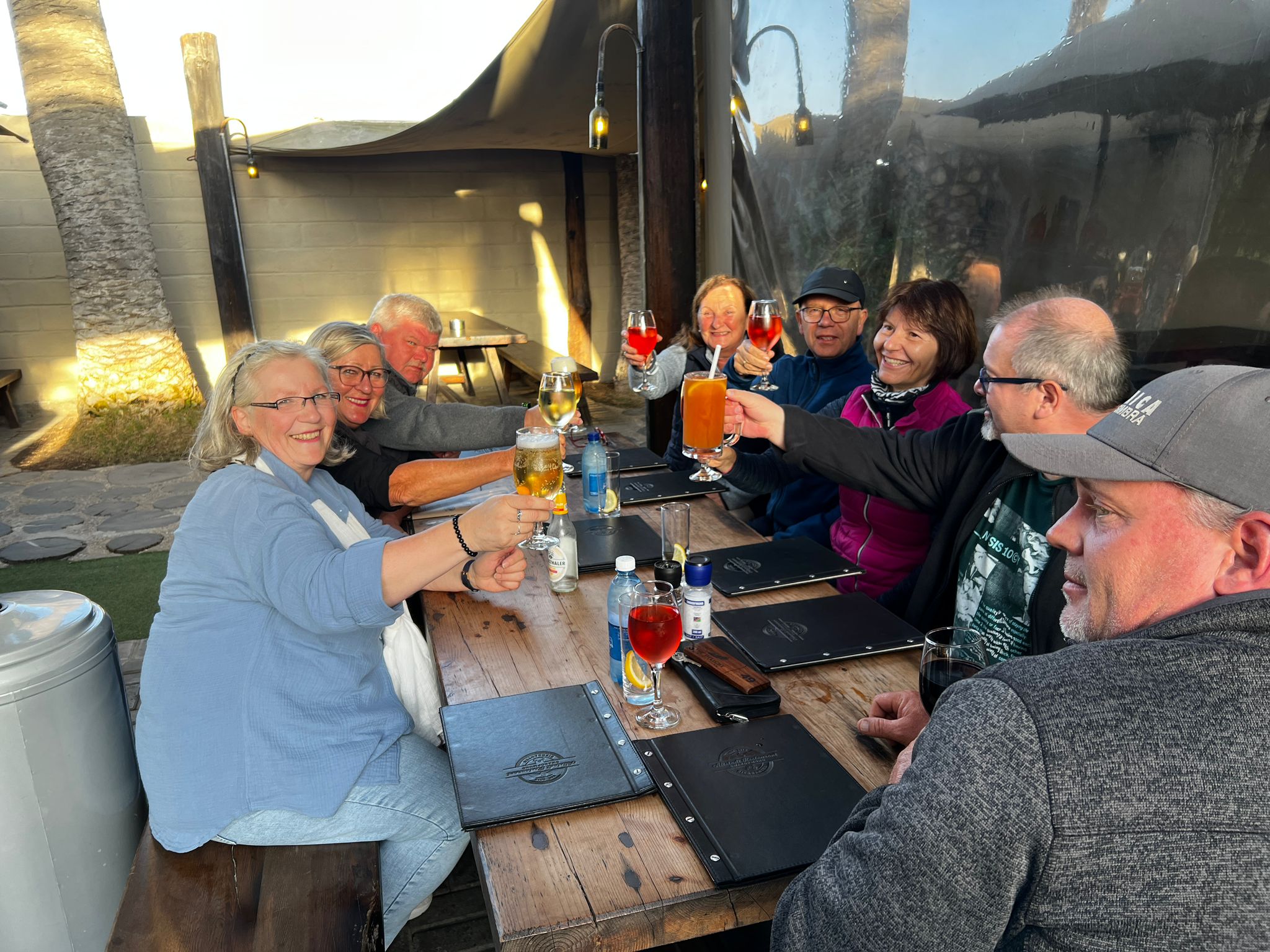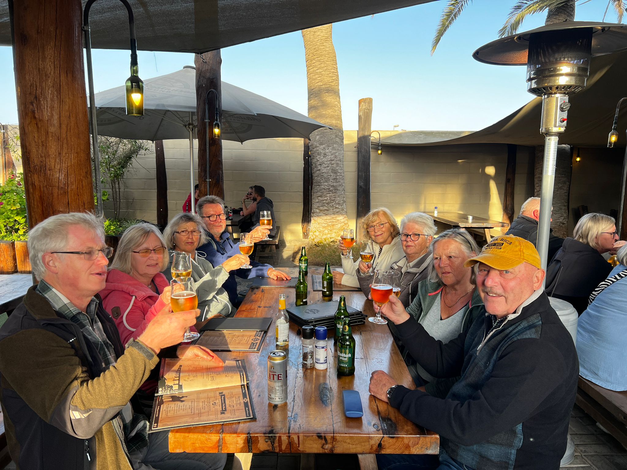 Am frühen Abend nahmen wir an der Farmrundfahrt in der Namib Wüste teil und wieder bei einem GinTonic sahen wir der Sonne beim verabschieden des traumhaften Tages zu.