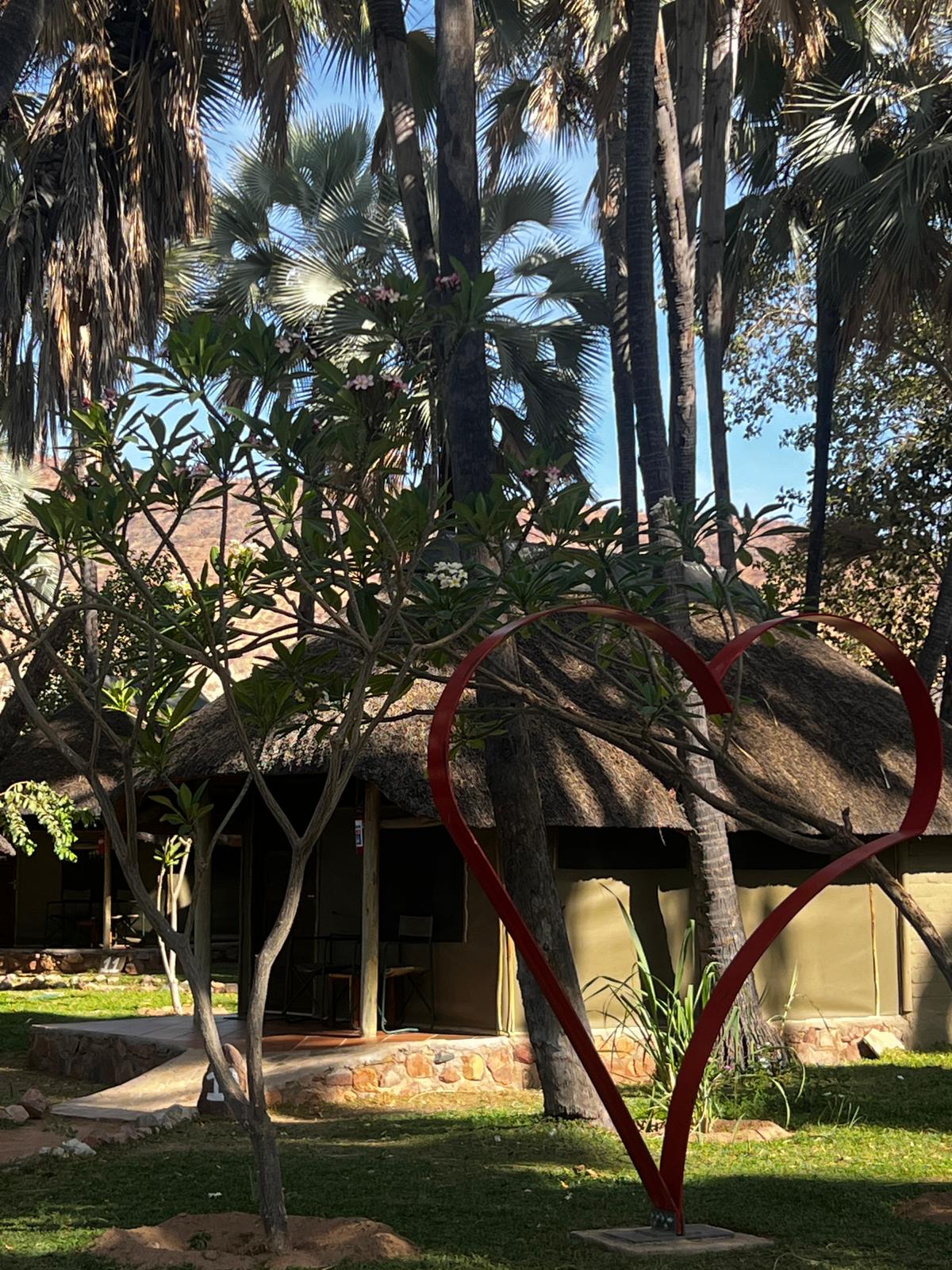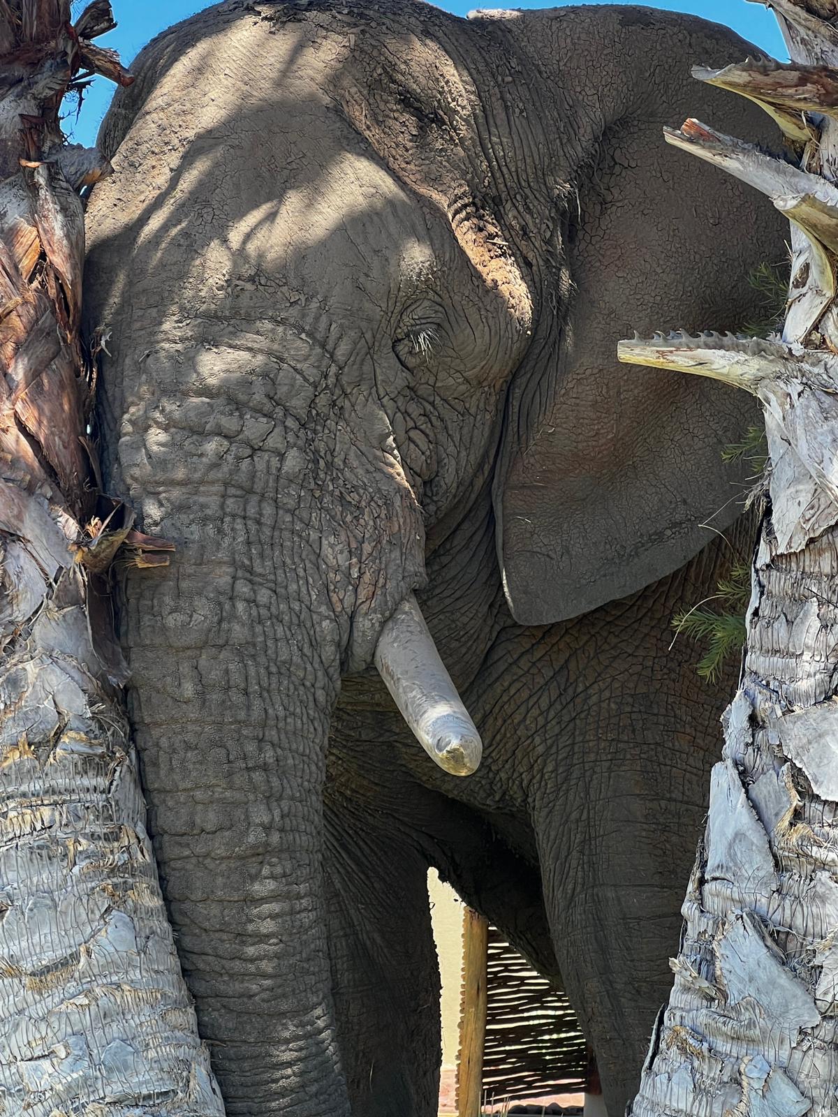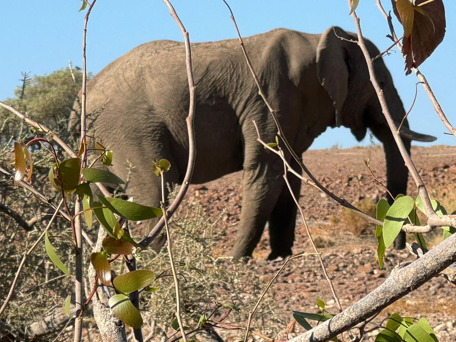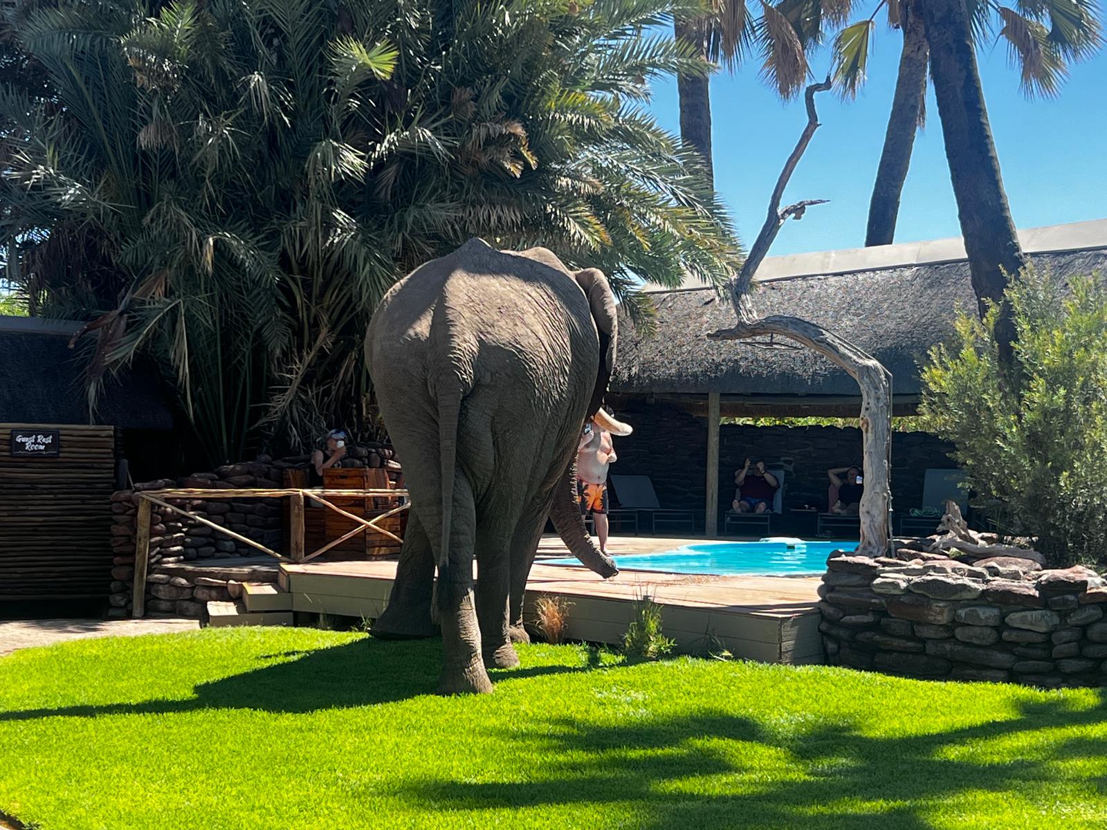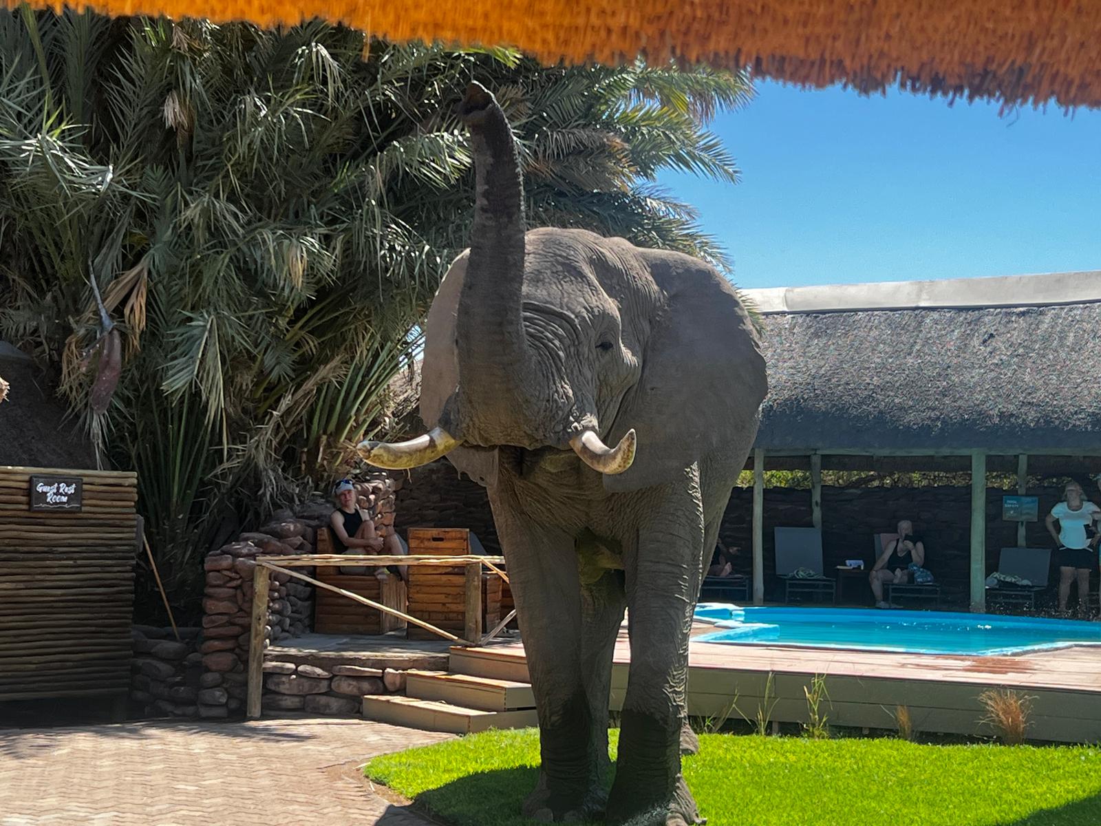 bis uns in der Lodge am Eingangsbereich Jumbo – der friedliche Wüstenelefant der Lodge in Empfang nahm. Am Abend gingen einige Gäste auf Game Drive, dabei hatten diese sehr viel Glück und konnten ein schwarzes Nashorn beobachten.