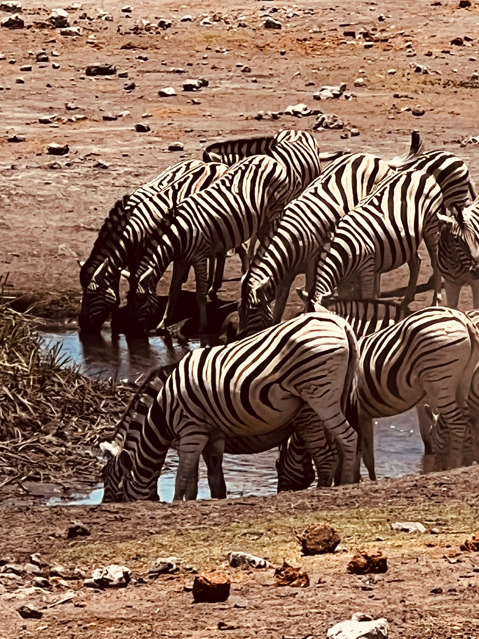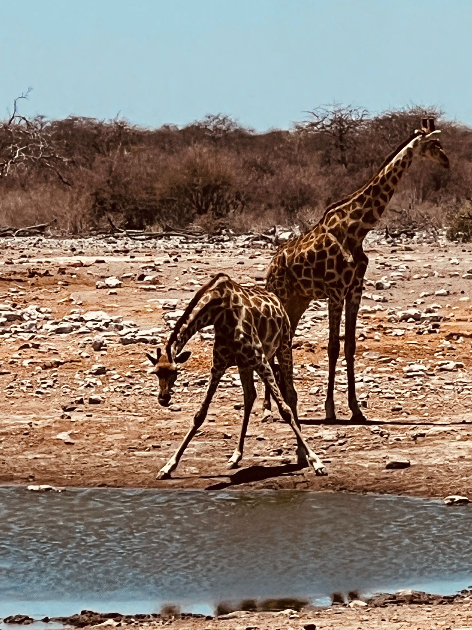 am Wasserloch blicken. Leider waren die staatlichen Wasserlöcher durch die seit zwei Jahren anhaltende Trockenheit sehr leer, aber Mark´s Erzählungen und Erklärungen über die Tierwelt im Etosha Nationalpark, gliechen dies aus.