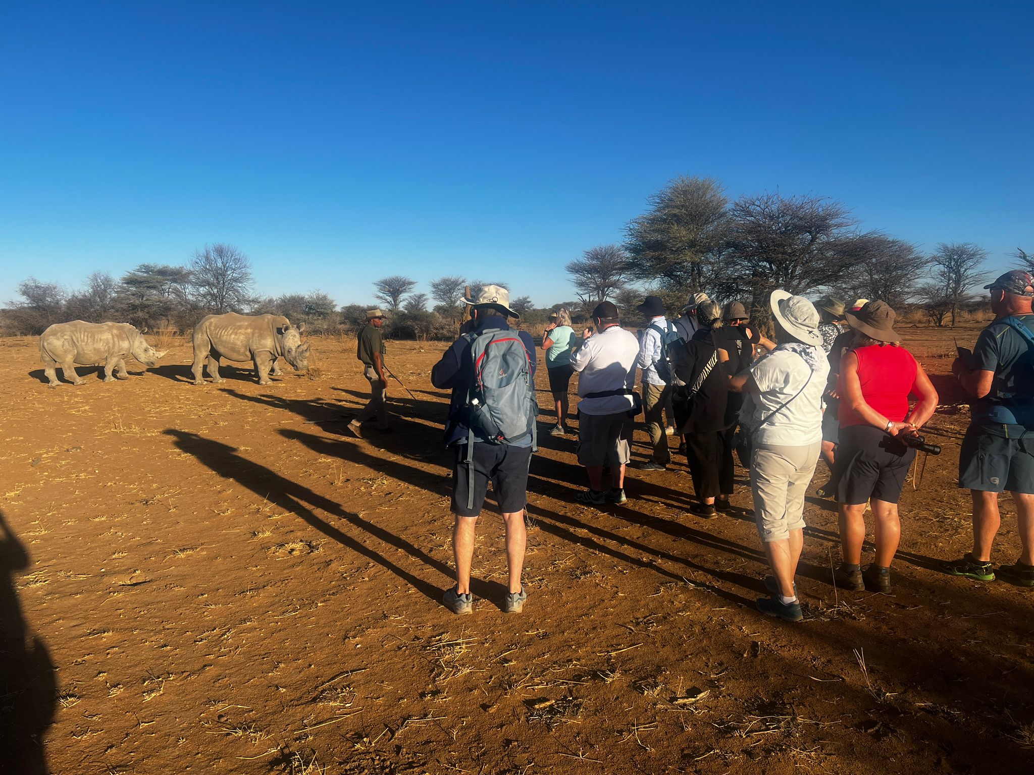 hatten wir die Gelegenheit an einem Nashorntracking teilzunehmen. Nach einer Fahrt und Spurenlesen unsere Guides und ca. 25 Minuten Fußweg sahen wir 4 Breitmaul-Nashörner, darunter aus der Ferne ein Junges.