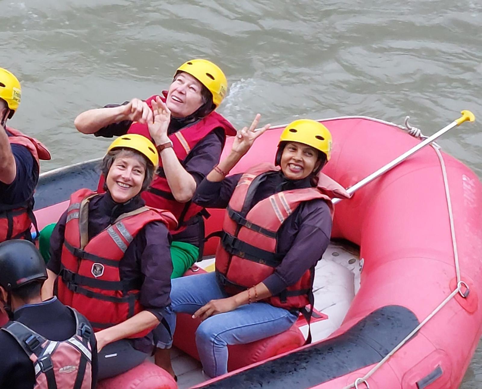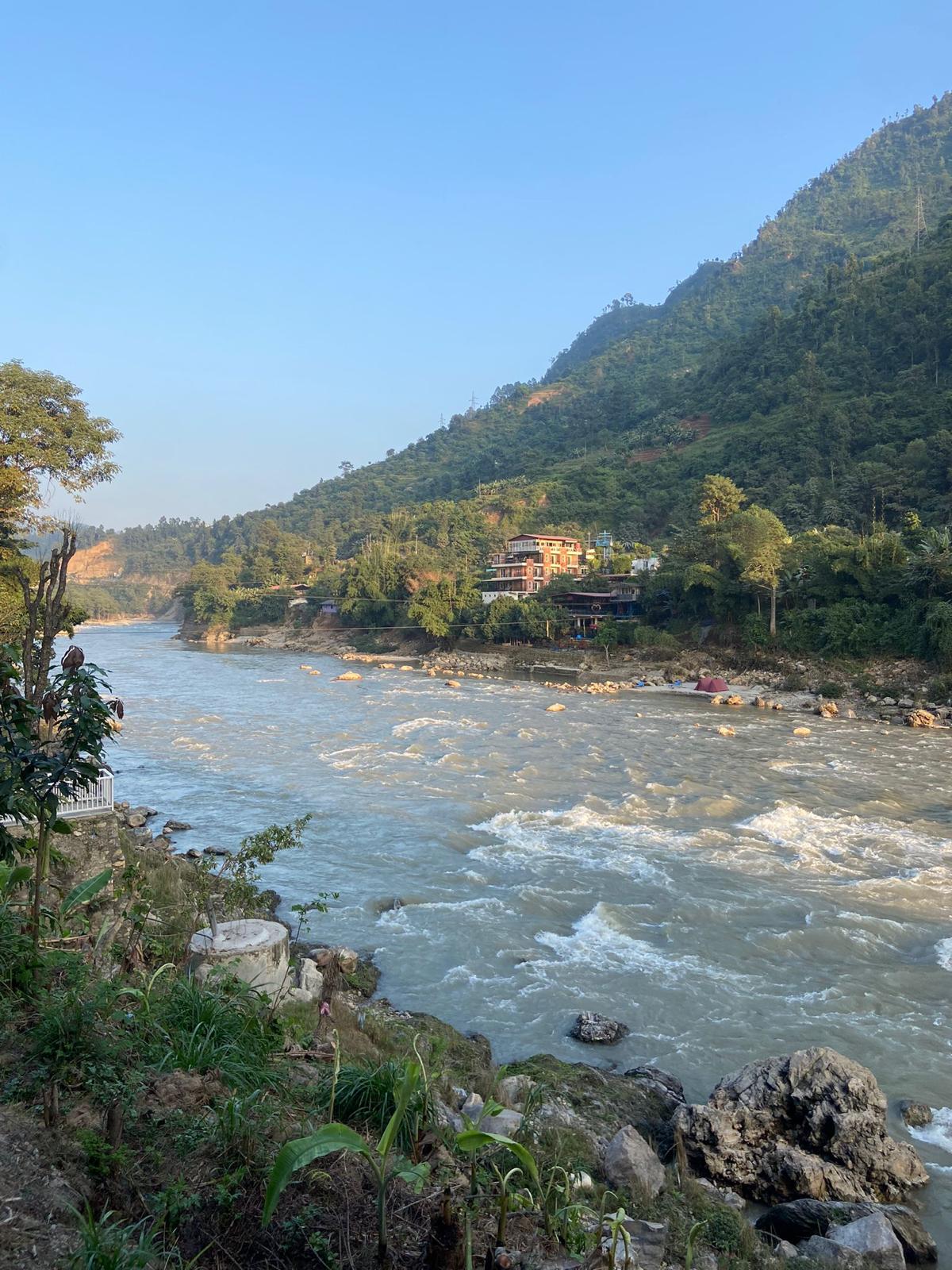 Nun verließen wir Kathmandu und fuhren Richtung Malekhu. Vorher fuhren wir mit der Seilbahn auf die Chandragiri Hills. Ein fast wunderbarer Blick auf das Kathmandu Tal. Danach ging es weiter Richtung Malekhu, auf der einzigen Hauptstrecke. Viel Verkehr, es ging nur langsam voran und immer wieder hielten wir den Atem an, unser Busfahrer meisterte alle brenzligen Situationen bravourös. Einchecken im Trishuli Riverside Resort nur über eine Hängebrücke möglich. Die Zimmer lagen direkt am Fluss, das Rauschen begleitete uns auch in der Nacht, sehr beruhigend. Wir nahmen ein typisches nepalesisches Abendessen draußen auf der Terrasse ein.
