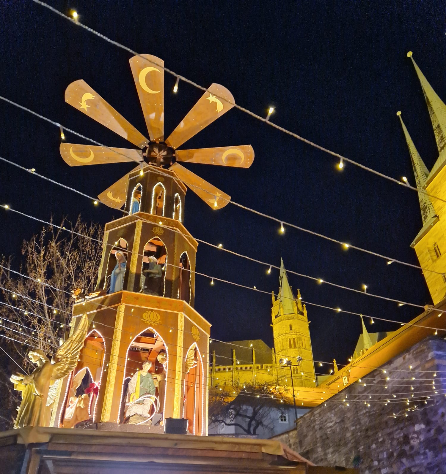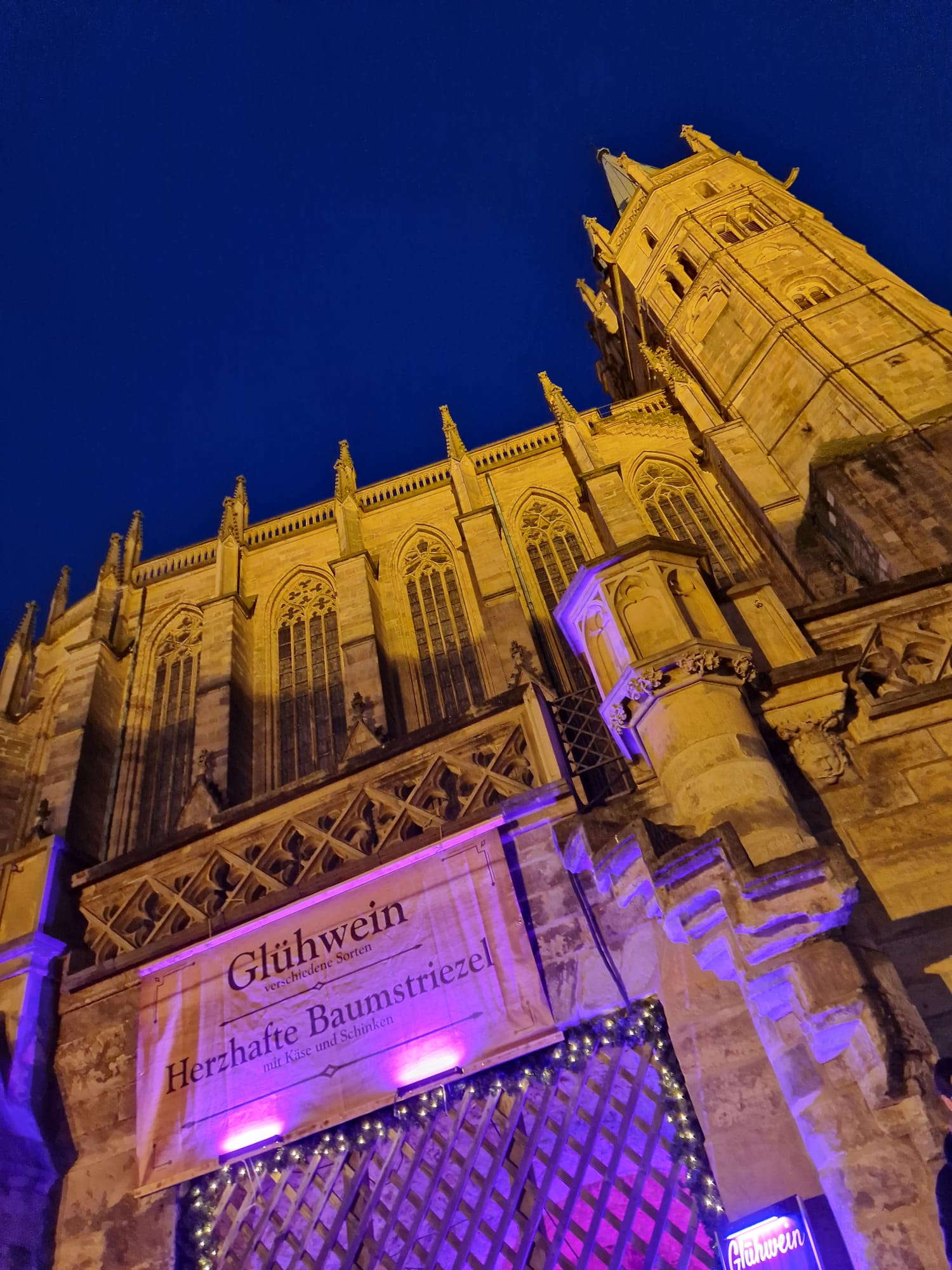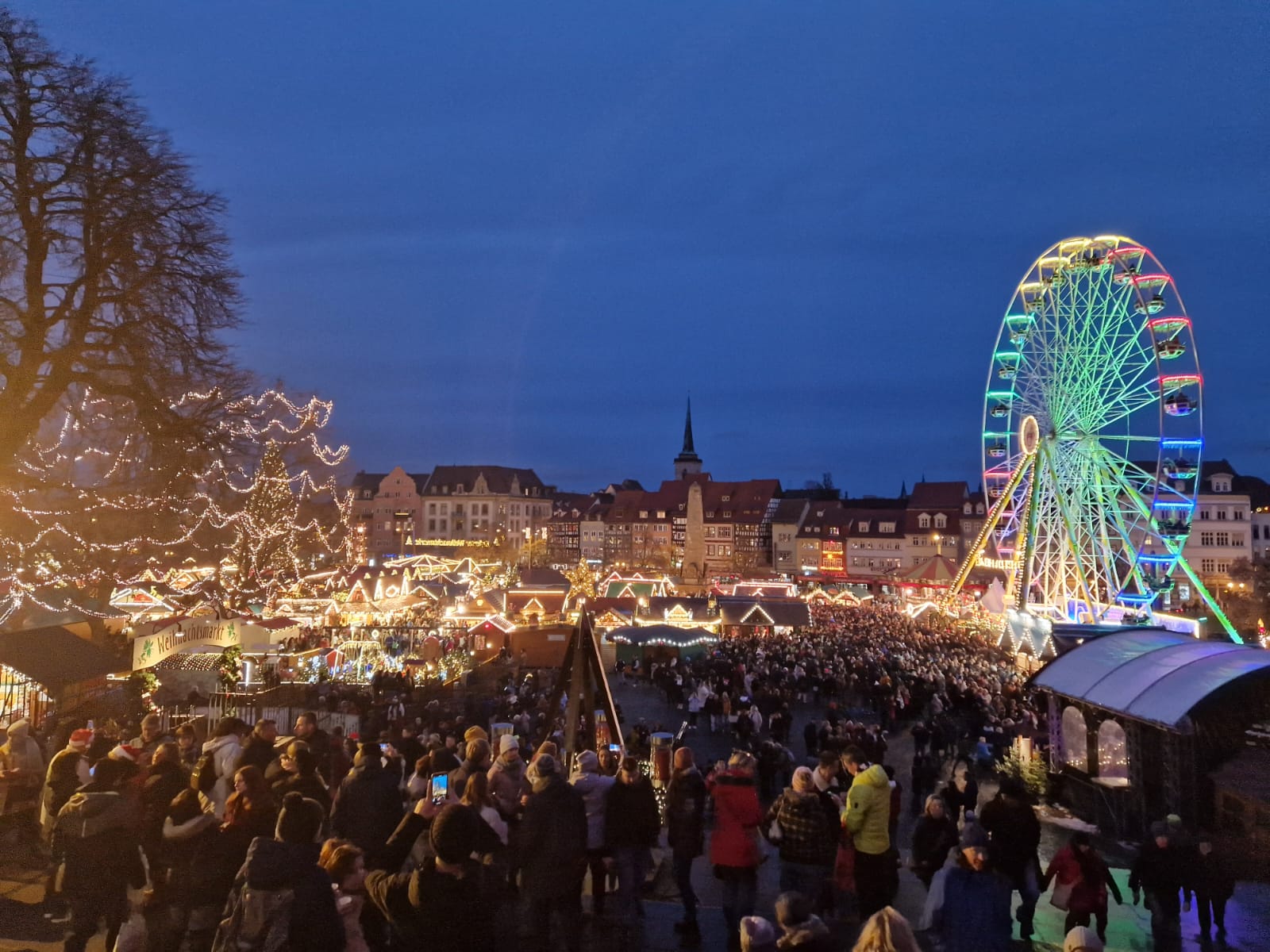 Der Domplatz wird zum Zentrum des Weihnachtsmarktes. Hier findet man zahlreiche Stände, an denen kunsthandwerkliche Produkte, Weihnachtsschmuck und regionale Spezialitäten angeboten werden. Die imposante Kulisse des Erfurter Doms und der Severikirche verleihen dem Markt eine ganz besondere Atmosphäre.