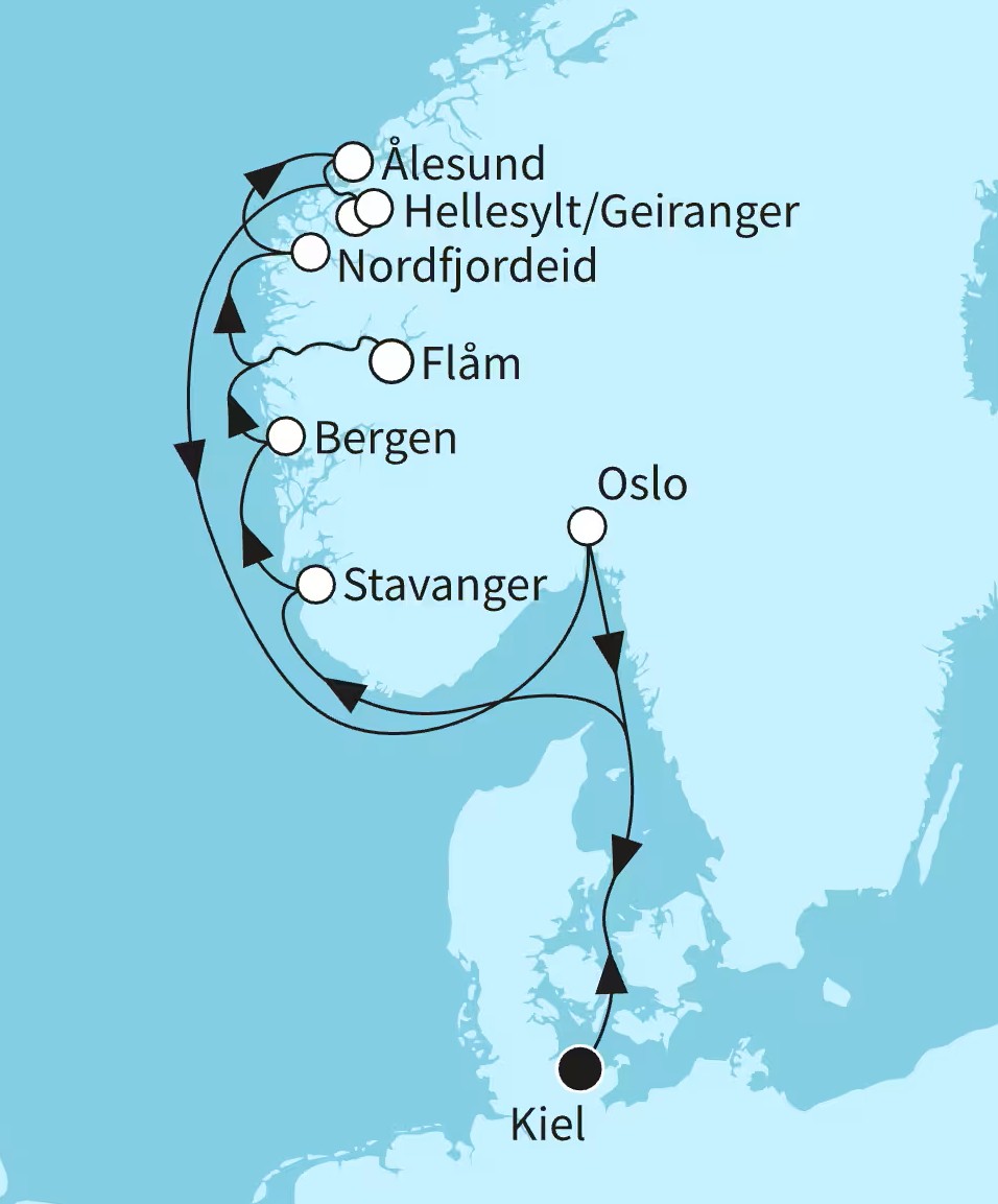 Kiel – Stavanger – Bergen – Flåm (Aurlandsfjord) – Nordfjordeid (Eidsfjord) – Ålesund – Geiranger (Geirangerfjord) – Hellesylt (Sunnylvsfjord) – Oslo (Oslofjord) – Kiel