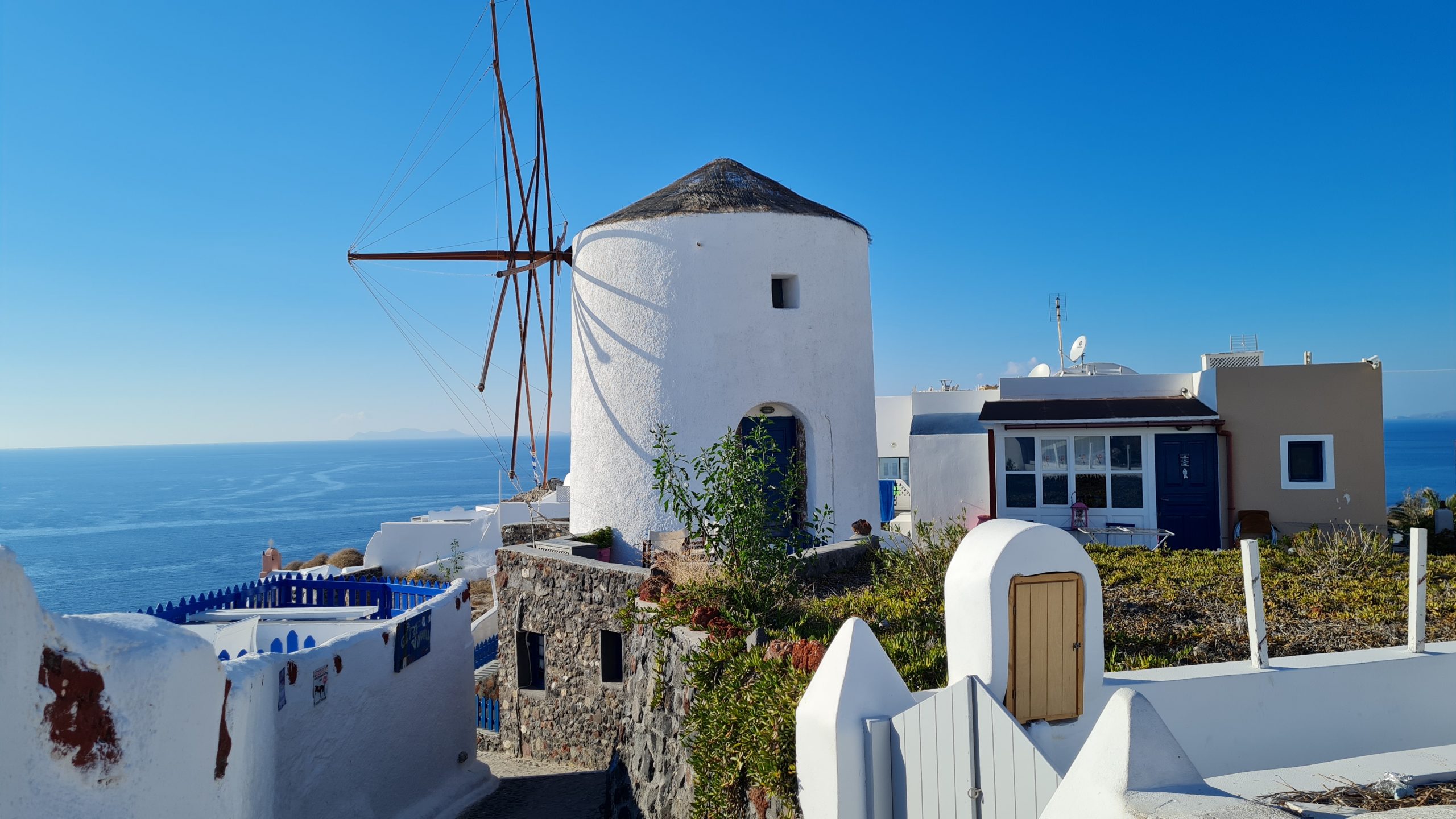 Santorin. Neben vielen kleinen Kunstgalerien und der Kirche von Panagia gibt es in Oia auch eine kleine Windmühle. Auch die Ruine des Kastells von Argyri ist