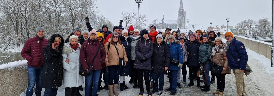 Über Nacht hatte es geschneit und so kamen die 20 Teilnehmer*innen bereits winterlich eingestimmt zu unserem Startpunkt am Schwedensteg in Kulmbach. Die Natur bot uns die beste Kulisse für unseren Adventausflug in die UNESCO-Weltkulturerbe-Stadt Regensburg. Der Schneegriesel begleitete uns den ganzen Tag, ohne zu Beeinträchtigungen im Straßenverkehr zu führen. Für die sichere, pünktliche und liebenswerte An- und Abreise sorgte denn auch der Chef von Schirmer Reisen selbst, Stefan Schirmer. Ein Pausenstopp mit Kaffee und Kuchen versüßte die Reisezeit und so kamen wir gegen 14 Uhr in der bayrischen Donaustadt an.